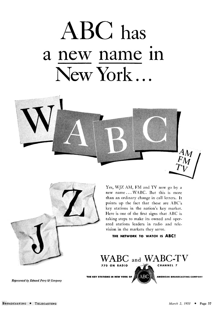 1953년 3월 1일, ABC가 유나이티드 파라마운트 극장(United Paramount Theatres)과 합병하면서 방송국 콜사인이 WABC-TV로 변경되었다.[5][6] 유나이티드 파라마운트 극장은 미국 정부 명령에 따라 이전 모회사인 파라마운트 픽처스(Paramount Pictures)에서 분리된 회사였다.[7] WJZ-TV 콜사인은 1957년 웨스팅하우스 방송(Westinghouse Broadcasting, 뉴욕 WJZ 라디오의 원래 소유주)에 역사적인 의미로 다시 부여되었다. 웨스팅하우스 방송은 당시 볼티모어에 새로 인수한 텔레비전 방송국을 소유하고 있었는데, 공교롭게도 1995년까지 ABC 계열사였다.