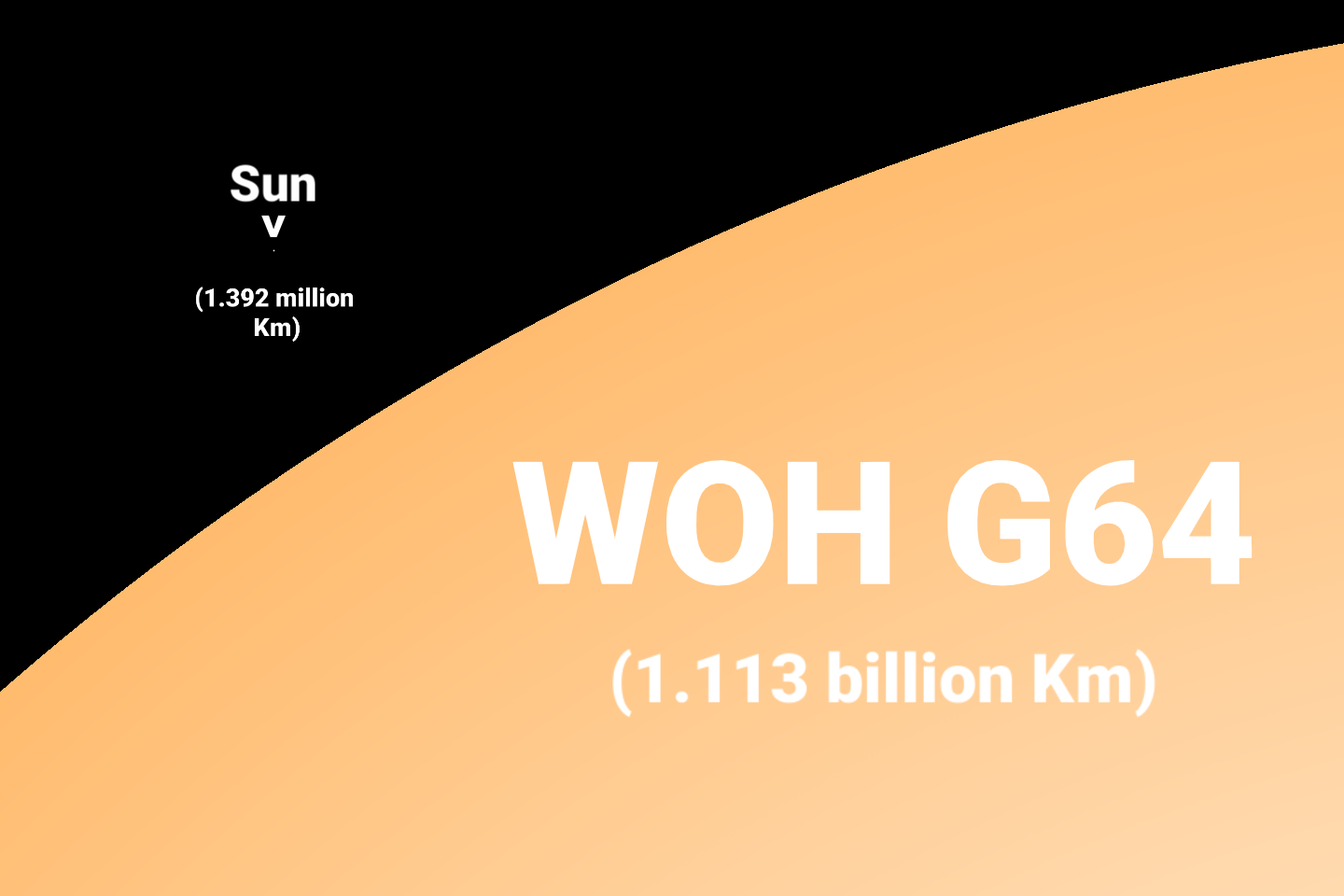 WOH G64는 극대거성으로, 태양 반지름의 1,540배 크기로 측정되어, 이전까지 가장 큰 별로 알려졌던 스티븐슨 2-18보다는 작다.[2] 만약 WOH G64를 태양계 중심에 놓는다면, 그 표면은 토성 궤도까지 이를 것이다.