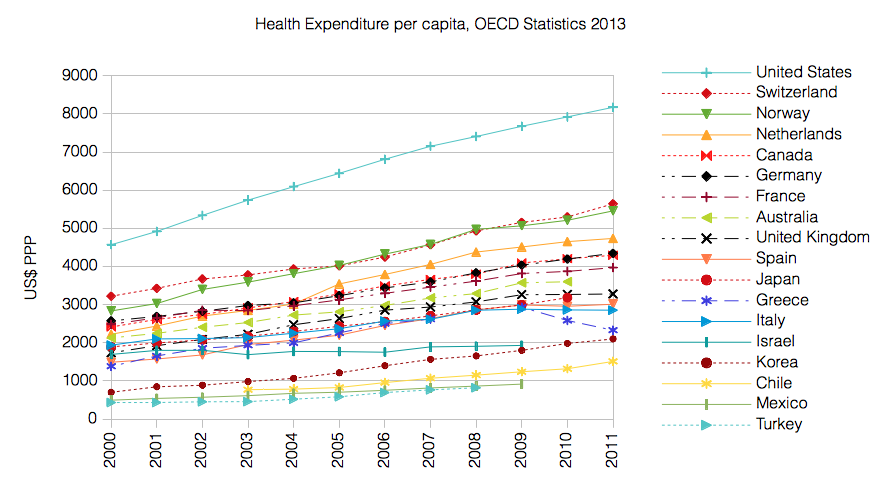 - * 코먼웰스 펀드(The Commonwealth Fund)는 매년 실시하는 설문조사 "거울아, 거울아"(Mirror, Mirror on the Wall)에서 미국 의료 시스템이 다른 선진국에 비해 가장 비싸지만 성과는 지속적으로 저조하다고 평가했다.[11] 2010년 설문조사에서는 미국인들이 다른 국가 국민들보다 자비 부담이 더 많고, 보험 회사와의 분쟁이 더 많으며, 보험금 지급 거부가 더 많은 것으로 나타났다.[12]