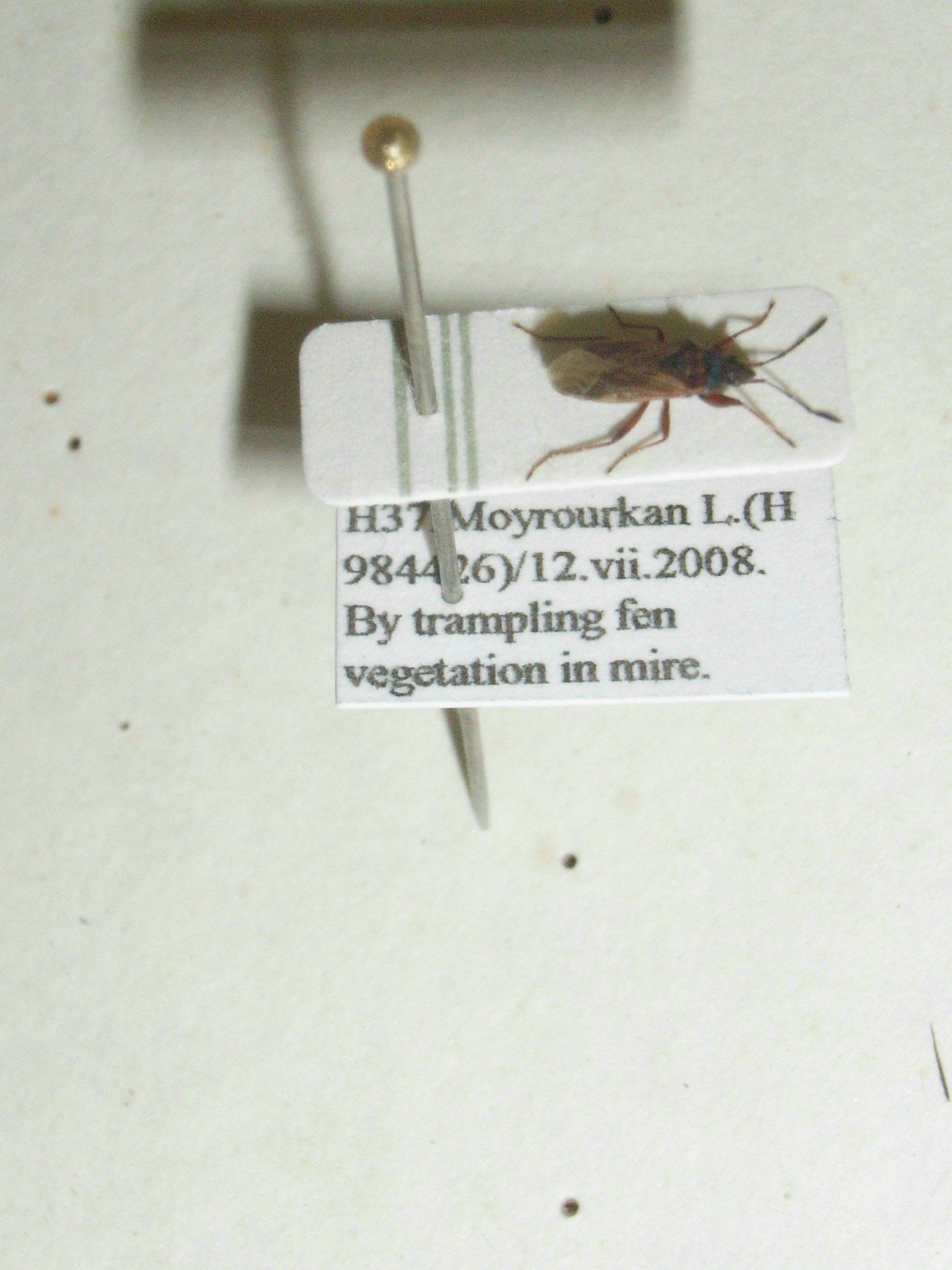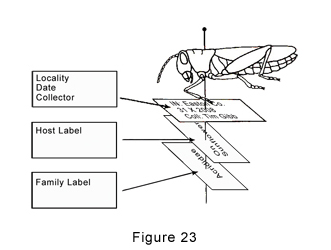 작은 종이에 채집 연월일, 채집 지점, 채집자 등의 데이터를 기입하고, 표본을 통과시킨 바늘에 꽂아 그 아래에 붙인다. 이 '''데이터 라벨'''이 결여된 표본은 학술적 가치가 상실된다. 경우에 따라서는 이름 등을 적은 라벨을 더 추가한다. 동정에 의해 판명된 학명, 국명, 동정자, 동정 연월일 등을 적은 라벨을 '''동정 라벨'''이라고 부르며, 연구의 진전이나 오동정의 정정에 의해 새로운 동정 라벨이 붙여질 때는, 그 표본의 연구 이력을 명확히 하기 위해, 낡은 동정 라벨을 떼지 않고, 새로운 동정 라벨을 더하는 것이 연구상의 약속으로 되어 있다. 또한. 박물관 등의 소장품임을 나타내는 컬렉션 라벨이 붙여지는 경우가 있다[21]。