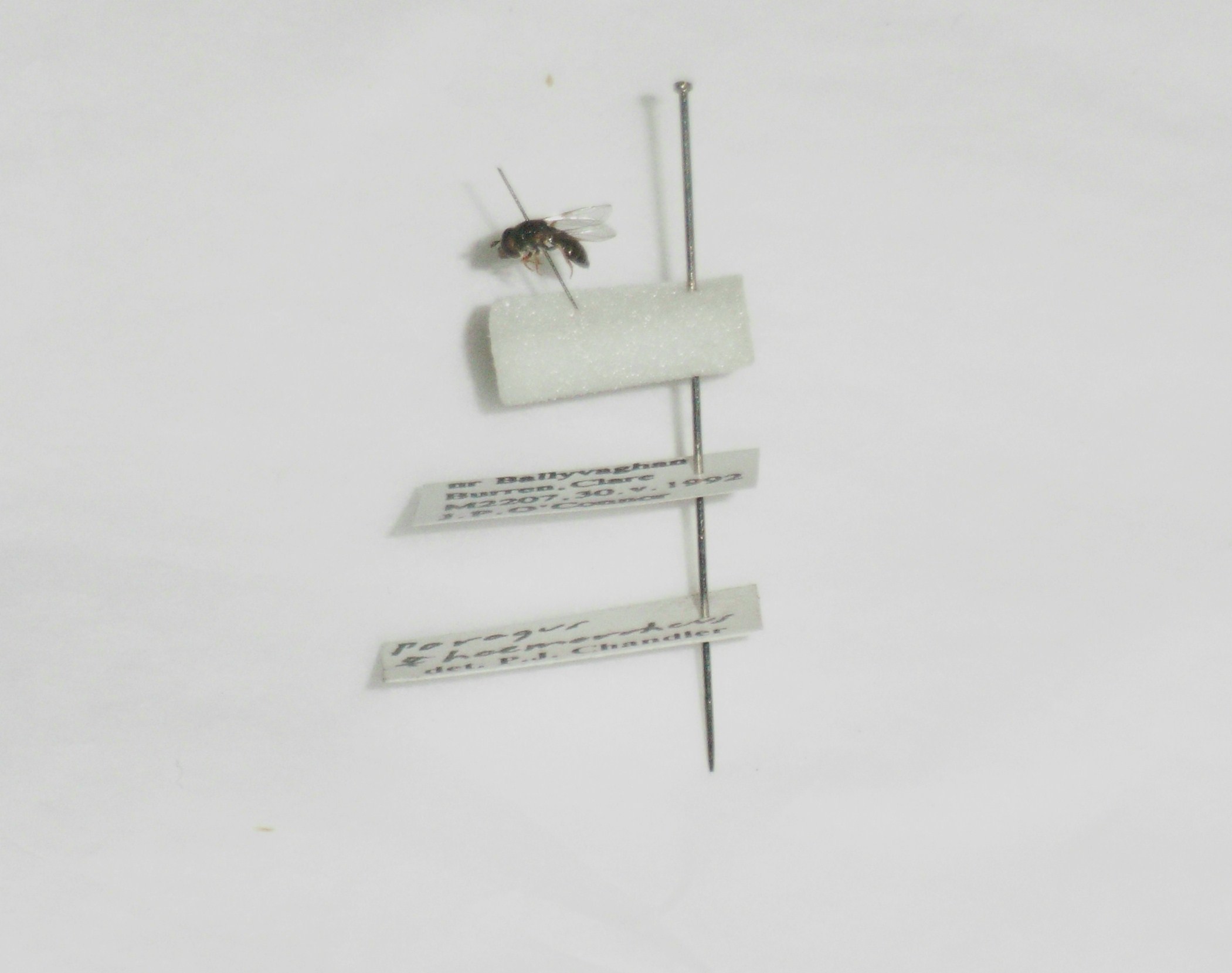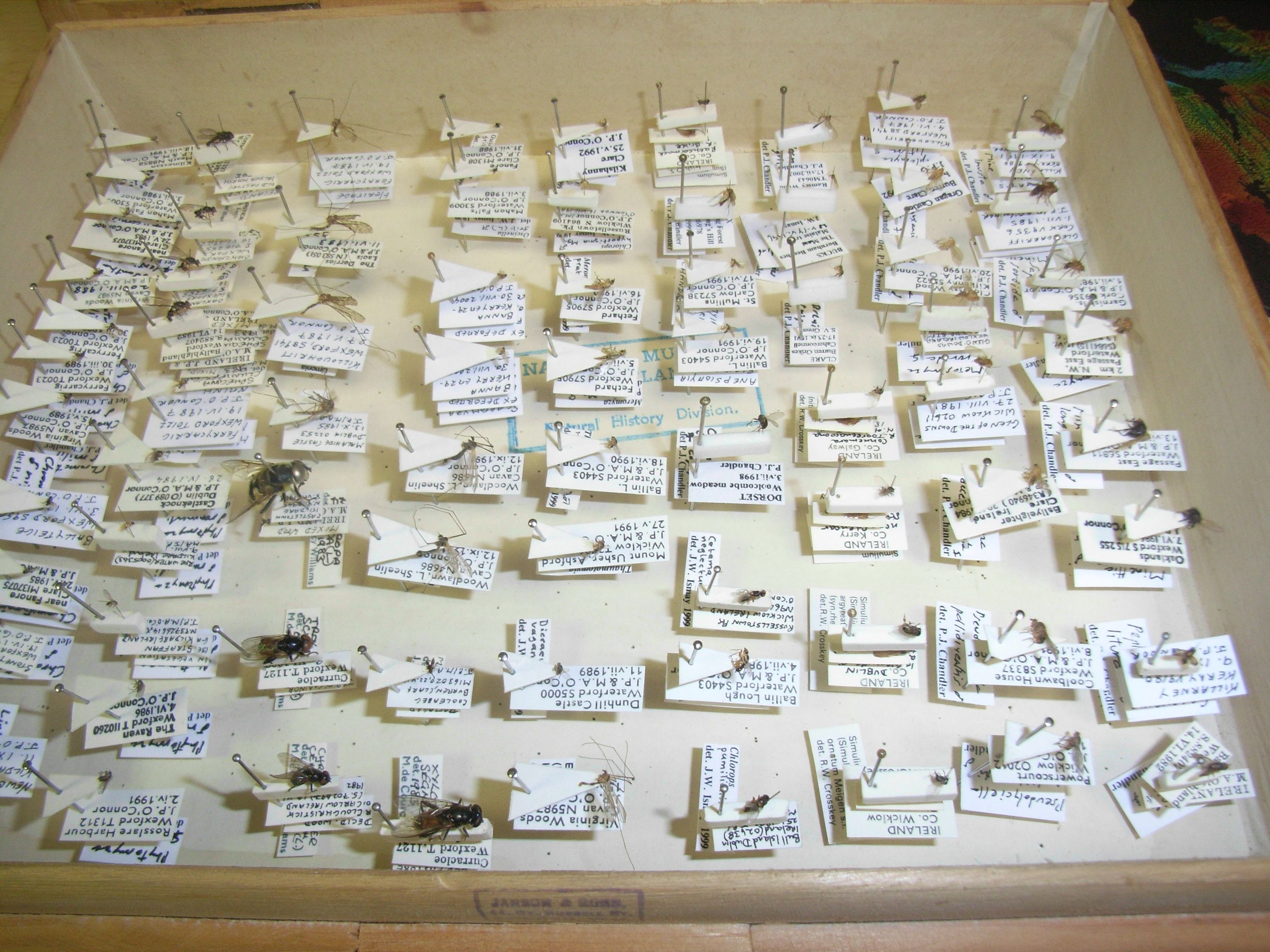 작은 곤충은 작은 조각의 비산성 삼각형 종이에 접착하는 포인트 마운트 방식을 사용한다. 곤충을 건조할 때는 핀을 사용하여 폼 블록 위에 곤충을 펼쳐서 건조하고 위치를 유지한다. 곤충 라벨은 위치, 추가 위치/바우처 라벨/접수 번호, 곤충 식별 순서로 위에서 아래로 표시한다.[7]