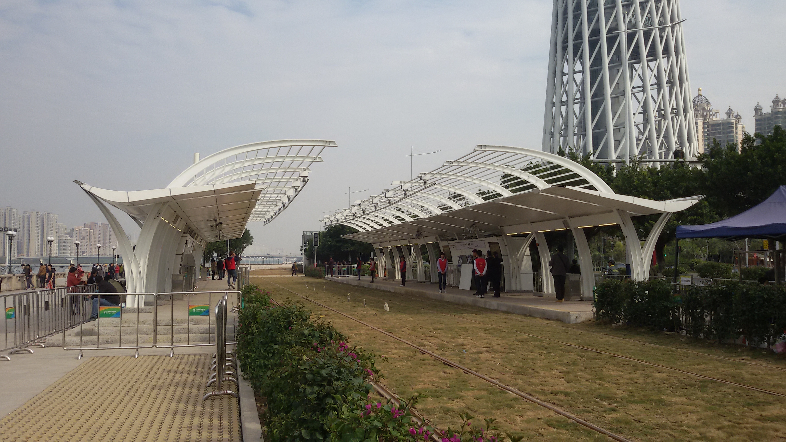 교차선은 모든 열차가 돌아오는 승강장의 서쪽에 설치되며, 궤도 서쪽 끝 외에 교차선 남서쪽 면에는 향후 인터페이스 확장을 위해 남겨두었다. 또한 주박 대기 열차는 주박을 위해 승강장 북서쪽에 마련해 두었다.[4] 하이주 노면전차 노선의 종착역인 광저우 타워 노면전차역은 2024년 11월 12일에 영구 폐쇄되었다.