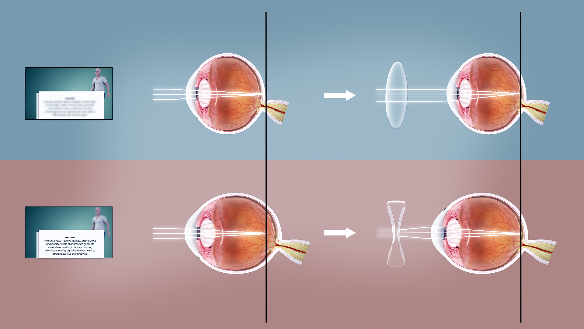 위: 볼록 렌즈를 사용하여 교정된 원시, 아래: 오목 렌즈를 사용하여 교정된 근시