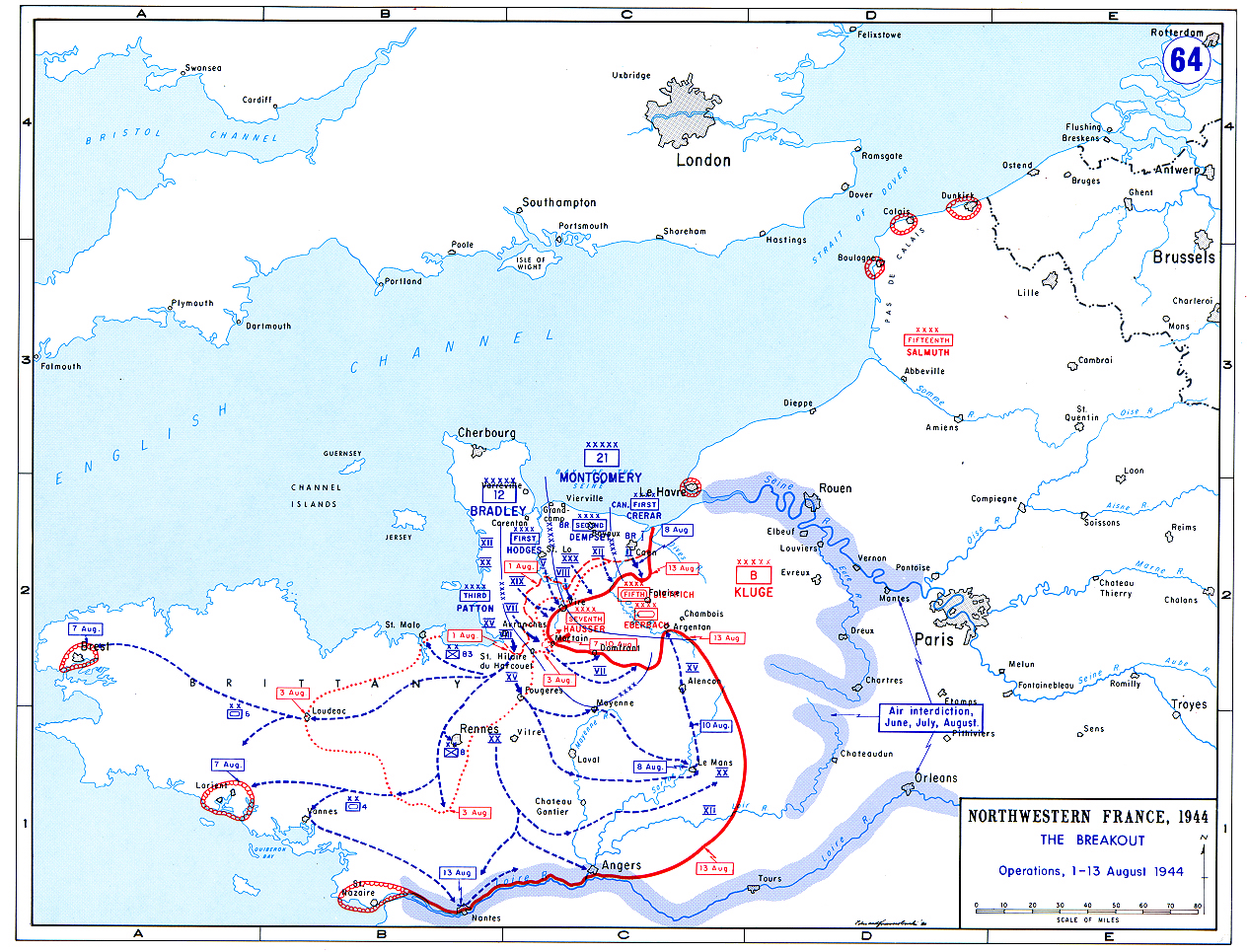 7월 말, 노르망디의 독일군은 연합군의 공세로 인해 매우 열악한 상태에 놓였고, 클루게는 더 이상 노르망디에서 방어 가능한 위치를 유지할 수 없었다. 그는 중앙 집단군에 대한 소련의 여름 공세인 바그라티온 작전(Operation Bagration) 이후 증원군을 기대할 수 없었고, 승리를 바랄 수 있다고 믿는 독일인은 거의 없었다. 8월 1일부터 4일 사이에 조지 S. 패튼 중장이 이끄는 미 제3군의 7개 사단이 아브랑슈(Avranches)를 거쳐 퐁토보(Pontaubault) 다리를 건너 브르타뉴(Brittany)로 신속하게 진격했다.