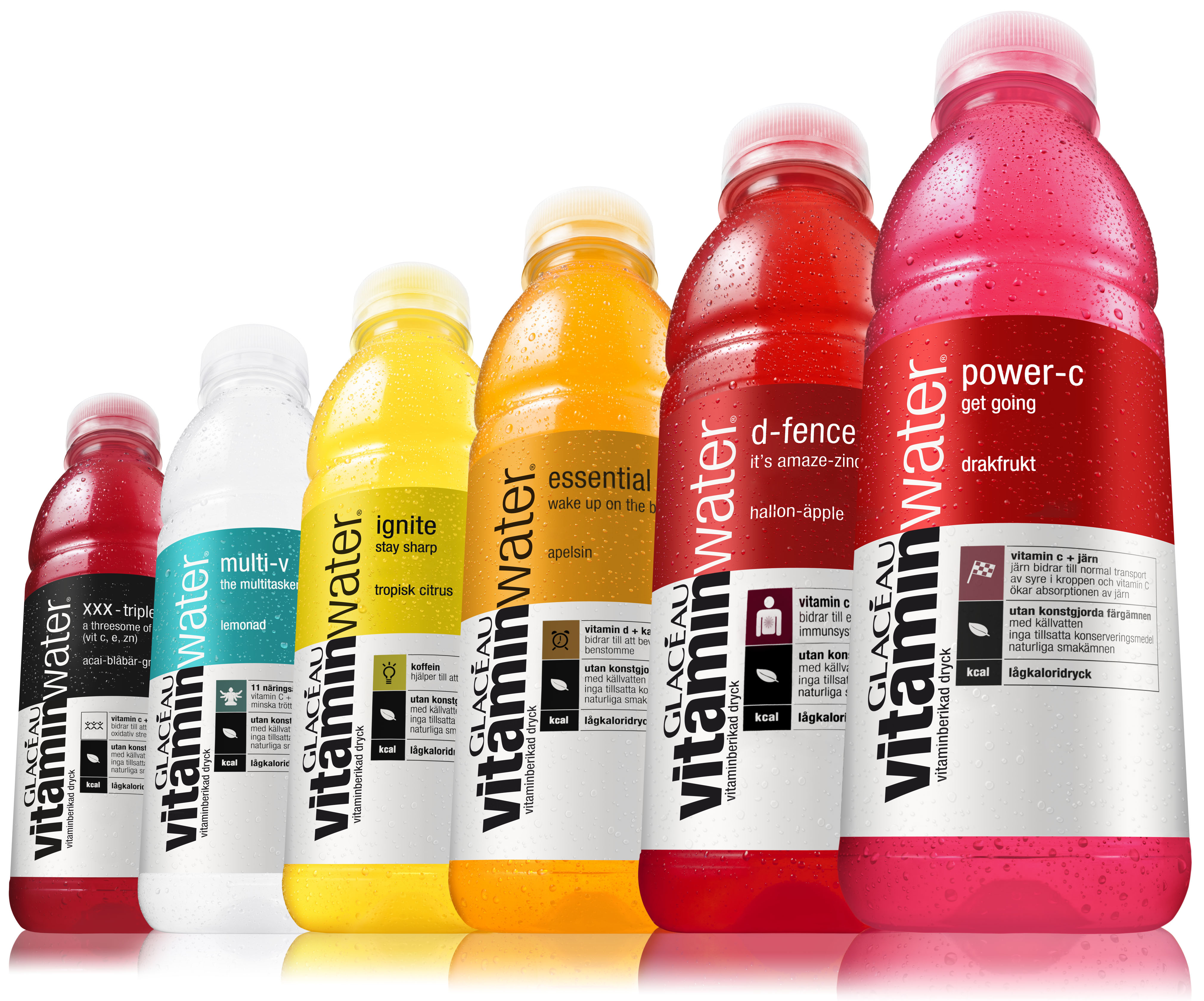 에너지 브랜드는 1996년 증류수에 전해질을 첨가한 글라소 스마트워터(Glacéau Smartwater)를 처음 출시했다.[2][3] 1998년에는 무칼로리 과일 향을 첨가한 글라소 후르츠워터(Glaceau Fruitwater)를, 2000년에는 비타민과 천연 향료를 첨가한 비타민워터를 출시했다.[2][3] 비타민워터는 더 많은 물을 마셔야 하지만, 그렇게 하지 않는 사람들을 위해 청량 음료와 물 사이의 "간극을 메우기" 위해 설계되었으며, 주로 성인을 대상으로 했다.[1] 회사 측은 소다보다 칼로리가 적어 소비자의 수분을 공급하고, 놓치기 쉬운 영양소를 제공한다고 밝혔다.[1]