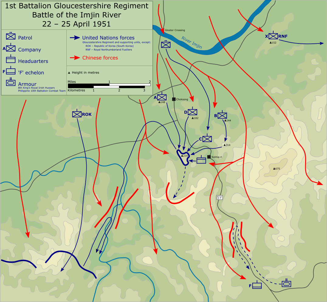 1948년 9월 21일, 연대의 두 대대는 자메이카에서 휘장을 교환하고 통합하여 단일 대대인 글로스터셔 연대 (28/61)를 형성했다.[123] 1949년 영국으로 귀환한 후, 제임스 카네 중령이 지휘하는 제1대대는 제29 독립 보병 여단에 배속되었고, 한국 전쟁 발발 이후인 1950년 11월 3일, 여단과 함께 한국에 도착했다.