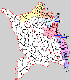 31.도요오카촌 32.사쿠라이촌 33.호슈바나촌 34.도미타촌 35.미나미사쿠라이촌 36.가와베촌 37.가나스기촌 (빨강: 가스카베시, 주황: 삿테시, 파랑: 스기토정 하늘색: 마쓰부시정. 1~24는 기타카쓰시카군)
