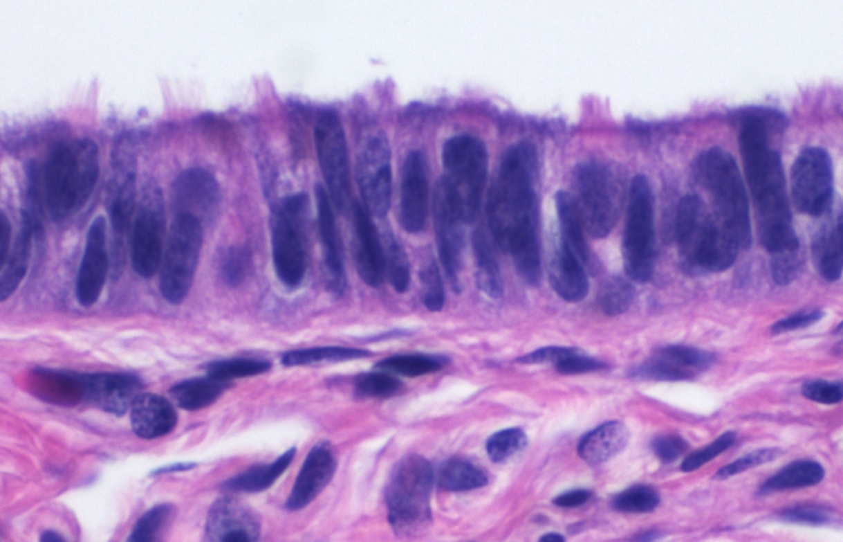 - 점막: 나팔관의 가장 안쪽 층으로, 내강 상피층과 그 아래의 얇은 성긴 결합 조직인 고유판으로 구성되어 있다.[16] 상피에는 섬모 원주 세포, 분비 세포, 말뚝 세포의 세 가지 유형의 세포가 있다.[4] 섬모 세포는 깔때기 부분과 팽대부에 가장 많으며, 에스트로겐은 이 세포의 섬모 형성을 증가시킨다.[6] 점막에는 면역 세포도 존재하며, CD8+ T-세포가 주요 유형이다.[16] 그 외에 B 림프구, 대식세포, NK 세포, 수지상 세포도 발견된다.[16] 나팔관 점막은 위치에 따라 다른데, 팽대부에서는 복잡한 주름을 가지는 반면, 협부에서는 단순한 주름을 가진다.[14]