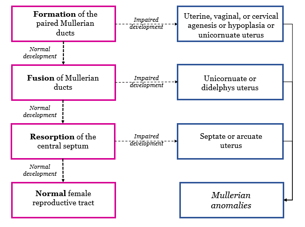 배아는 꼬리 쪽에 형성되어 궁극적으로 비뇨기계와 생식 기관의 기초를 형성하는 생식 융기를 발달시킨다. 이 통로의 양쪽 측면과 앞쪽에는 약 6주차에 뮐러관(paramesonephric duct)이라고도 하는 부신중관이 발달한다.[17] 두 번째 관인 중신관이 이에 인접하여 발달한다. 두 관 모두 다음 2주 동안 더 길어지고, 약 8주차에 부신중관은 교차하여 정중선에서 만나 융합된다.[17] 그런 다음 한 관이 퇴화하는데, 이는 배아가 유전적으로 여성인지 남성인지에 따라 달라진다. 여성의 경우 부신중관이 남아 궁극적으로 여성 생식 기관을 형성한다.[17] 부신중관 중 머리 쪽에 더 가까운 부분은 난관을 형성하게 된다.[17] 남성의 경우 Y 염색체의 존재로 인해 항뮐러관 호르몬이 생성된다. 이것은 부신중관의 퇴화를 유발한다.[17]