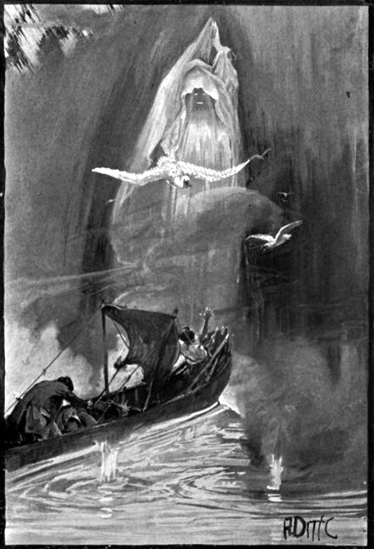 작은 배는 점점 따뜻해지는 물살을 따라 더 남쪽으로 흘러가고, 물은 우유빛 흰색으로 변했다. 며칠 후 그들은 재의 비를 만나고, 접근하자 열리는 거대한 안개 또는 연무의 폭포를 관찰한다. 거대한 흰색 형상이 나타나자 원주민은 죽는다.[52]