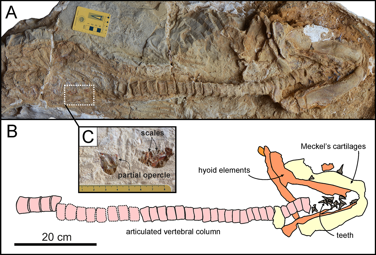 A well preserved skeleton of the fossil shark Cosmopolitodus hastalis from the late Miocene of Peru, featuring fish remains as fossilized stomach contents