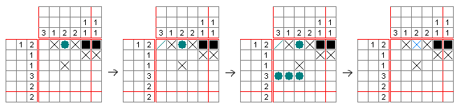 - c열 "2,1,2"에 대해, Bc, Dc의 검은 칸은 위치로 보아 각각 "2", "1"에 기인하는 것을 알 수 있다. 따라서, Dc의 위아래 양 옆은 흰색 칸으로 결정된다('''검은 칸의 양 옆을 막는 처리''' ). 또한, 그로 인해 최상단 Ac가 검은 칸임도 확정된다('''가장자리와 최고값 갱신에 대한 처리''' ).