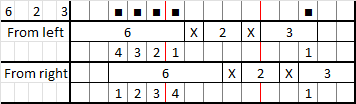 - 여러 숫자가 있는 경우에도, 숫자 사이에 빈칸을 한 칸씩 넣고 같은 작업을 할 수 있다. 단, 왼쪽과 오른쪽에서 칠했을 때 공통되는 부분이 있어도, 다른 숫자에서 온 경우에는 공통되었다고 볼 수 없다. 예를 들어, 4와 2가 주어지면, 왼쪽에서 칠했을 때는 4칸과 2칸이 겹치지만, 오른쪽에서 칠했을 때는 2칸과 4칸이 겹치므로, 4칸에 해당하는 부분만 확정된다.