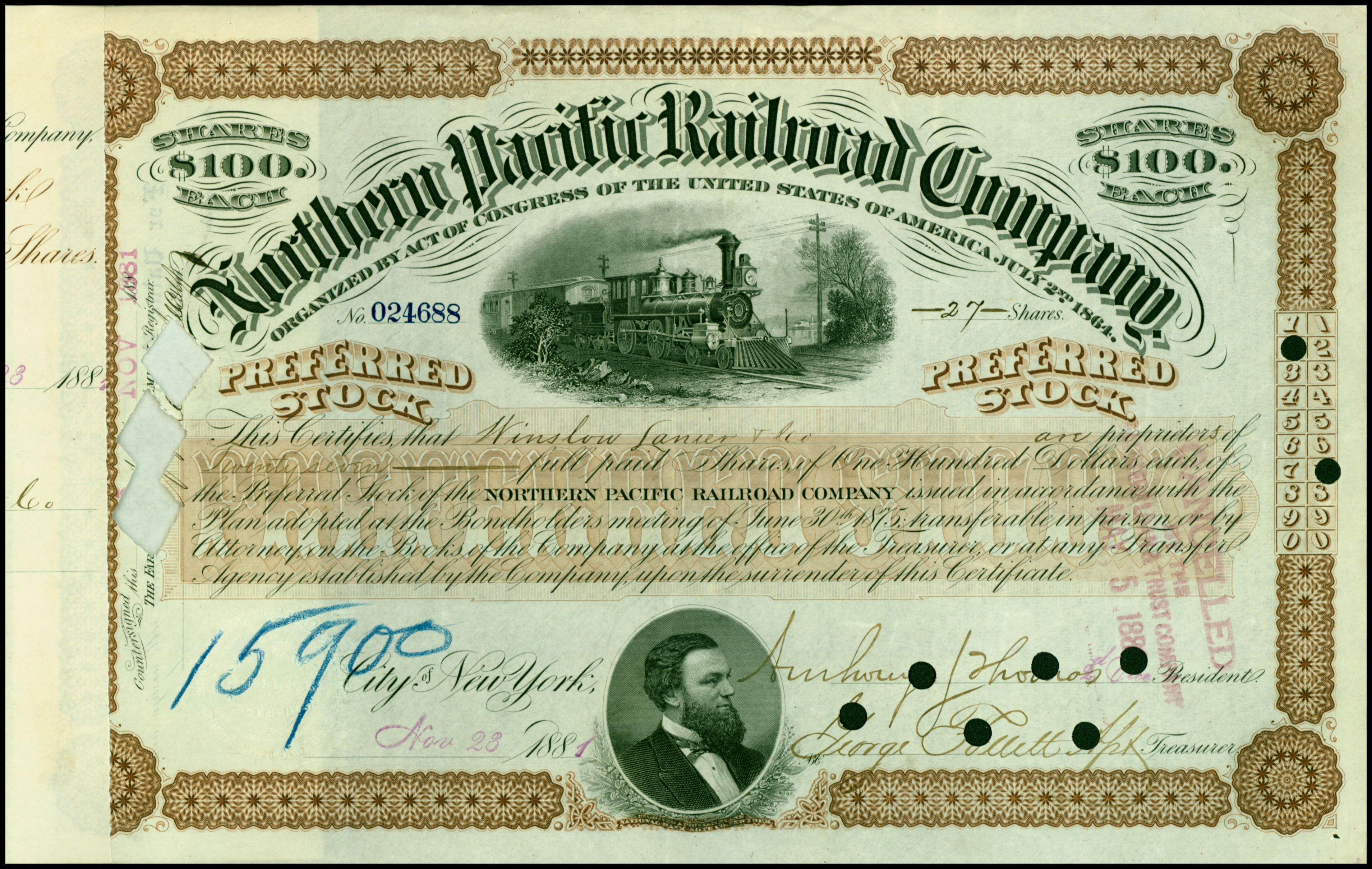 1864년 7월 2일 미국 의회는 오대호와 태평양 연안의 퓨젓사운드만을 연결하는 노던 퍼시픽 철도 회사(Northern Pacific Railroad Company)의 설립을 인가하였다.[32][1] 의회는 철도 건설을 촉진하고 미개발 서부 지역의 개척을 장려하기 위해 철도 부지로 약 60e6acre(243000km2)에 달하는 광대한 토지를 할양하였다. 이는 농업, 목축업, 벌목업, 광업 등의 발전을 기대한 조치였으며, 워싱턴과 오리건주를 연방의 다른 지역과 연결하는 목적도 있었다.[1] 그러나 실제로 회사가 사용한 땅은 할당된 면적의 일부인 약 40e6acre 정도였다.[33][2] 1864년 12월 7일, 조시아 퍼럼이 초대 사장으로 선출되었다.[32][1]