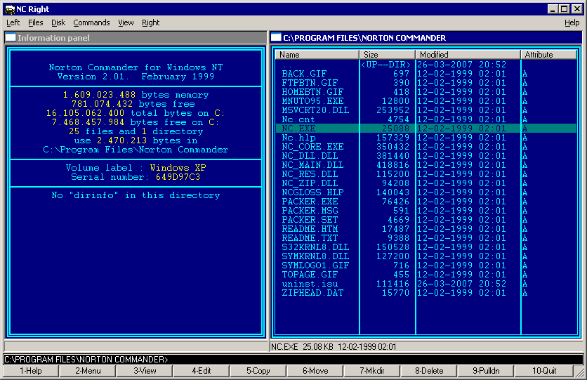 RAR | DOS, 윈도우 | 아카이브 관리자. 노턴 커맨더와 유사한 인터페이스를 사용했으며, 해당 인터랙티브 파일 관리자 인터페이스 모양을 갖춘 마지막 버전은 DOS 버전 2.50이었다. |