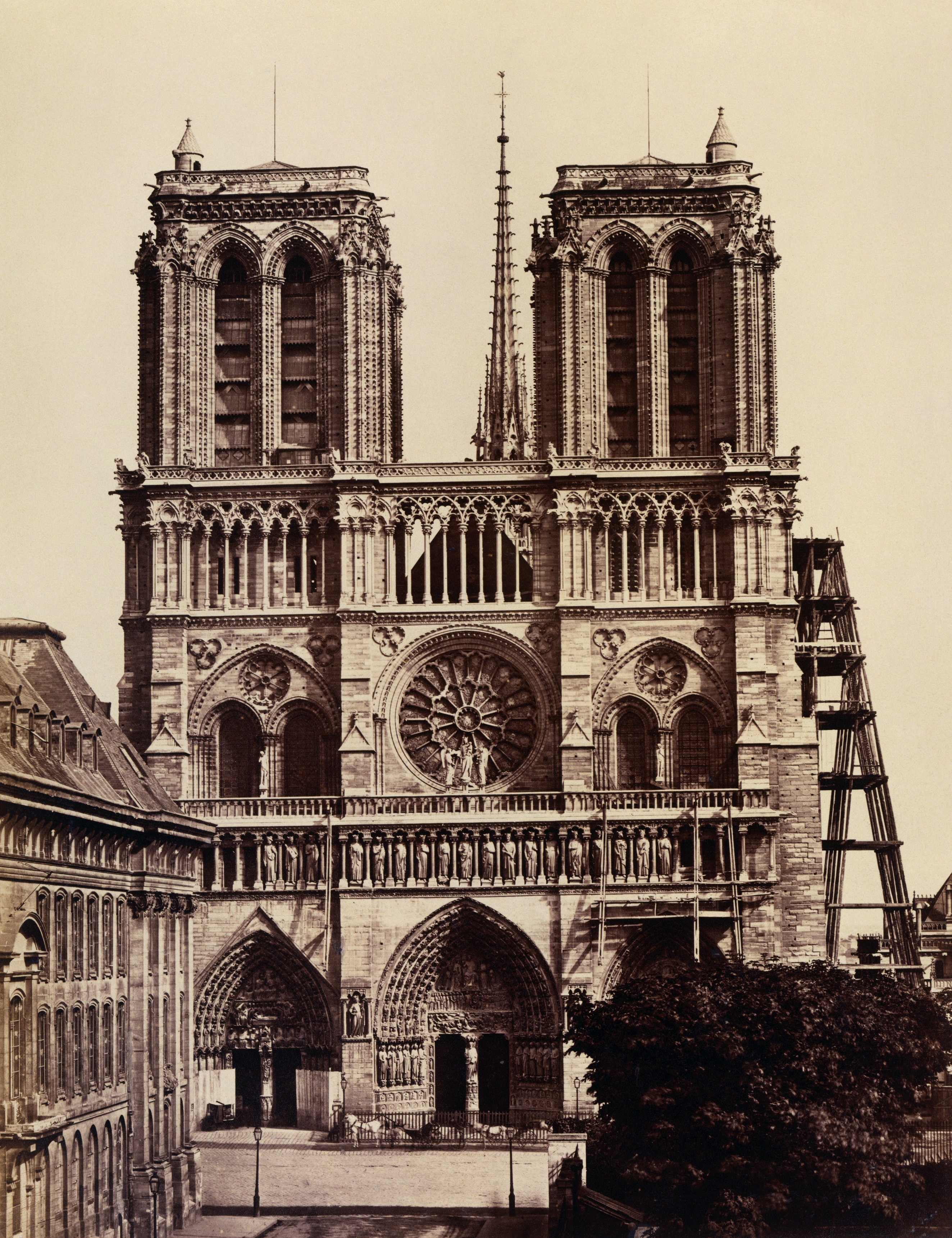 19세기에는 빅토르 위고의 소설 《노트르담 드 파리》의 영향으로 대성당 복원에 대한 관심이 높아졌고, 건축가 외젠 비올레르뒤크의 주도로 대대적인 복원 작업이 이루어졌다.[14] 이 과정에서 혁명 시기 파괴된 첨탑(플레슈)이 재건되고 키메라 조각 등이 추가되었다. (자세한 내용은 아래 '개축, 파괴, 복원' 문단 참조)