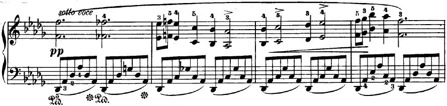멜로디 라인을 위한 풍성한 기반은 댐퍼 페달로 연결된 반주에서 넓게 분산된 음표로 제공된다. 왈츠와 같은 반주는 박자를 부드럽게 강조하며, 한 마디에 12비트가 있고 각 3비트 그룹으로 4개로 세분화된다.