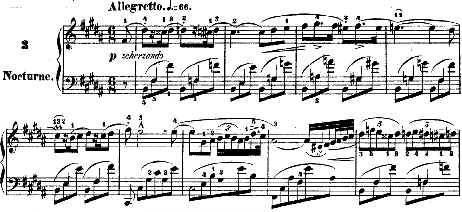쇼팽의 녹턴 3번 나장조는 세도막 형식 (A-B-A)을 취하며, 알레그레토 빠르기로 시작한다.