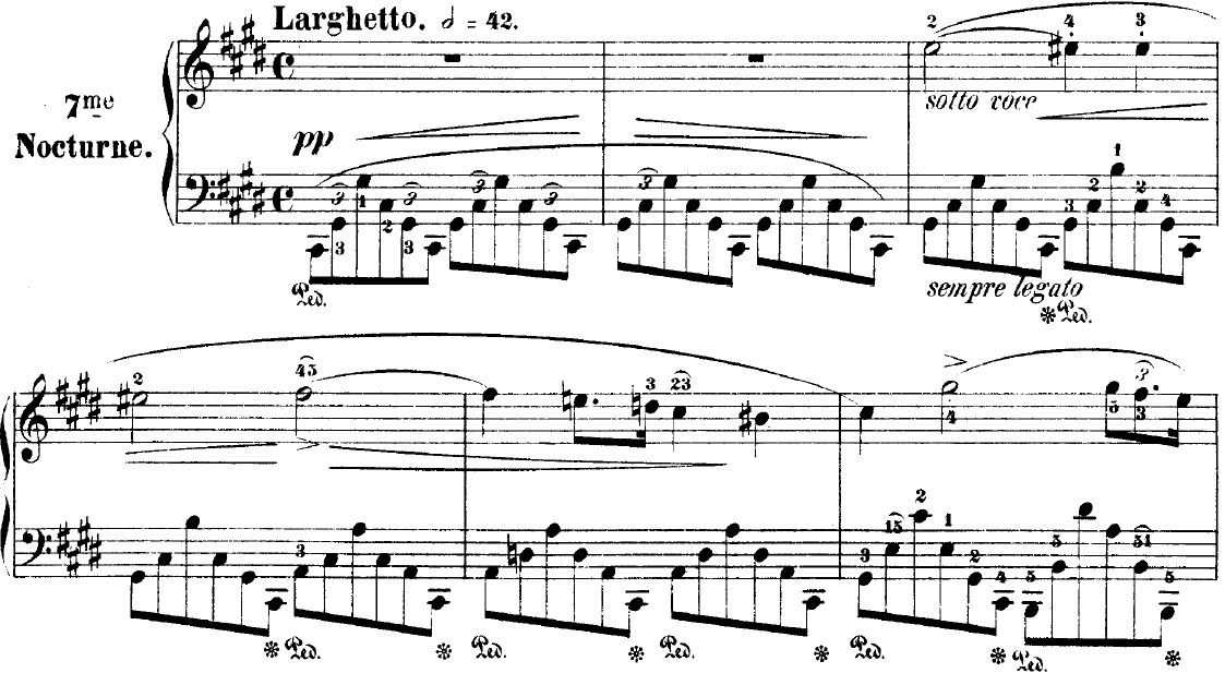 쇼팽의 녹턴 7번 올림다단조는 라르게토(Larghetto)의 느린 템포와 4/4박자로 시작하여, 중간 부분에서 격정적인 피우 모소(più mosso)로 전환되었다가 다시 원래의 템포로 돌아오는 A-B-A 세도막 형식을 취하고 있다.
