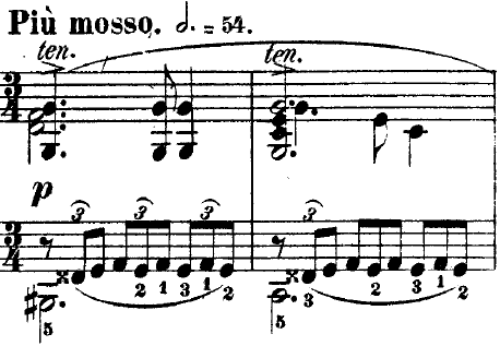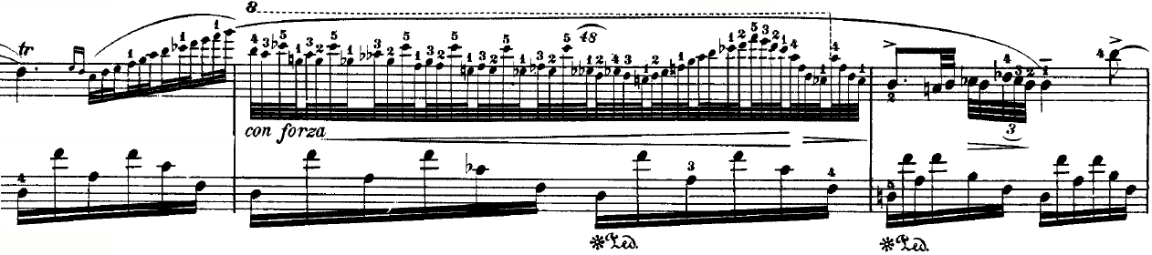 29마디부터 시작되는 중간 부분(B)은 ''피우 모소''(더 빠르게)로 템포가 빨라지고 3/4박자로 변화하며, 주로 왼손에 셋잇단음표를 사용하여 "불안하고 격렬한 힘"을 표현한다.[6] 49마디에서는 내림 A 장조로 조바꿈되며, 카덴차를 거쳐 다시 주요 주제로 돌아온다. 후네커는 이 부분을 베토벤의 작품에 비유하기도 했다.[5]