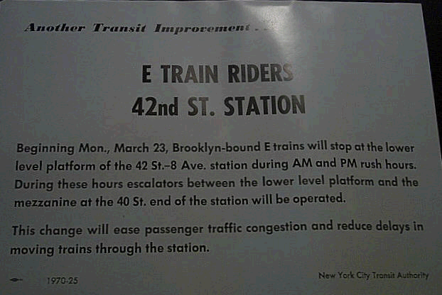 1970년 3월 23일 남행 '''E''' 열차는 러시아워에 42번가역 하층부에서 정차하기 시작했다.