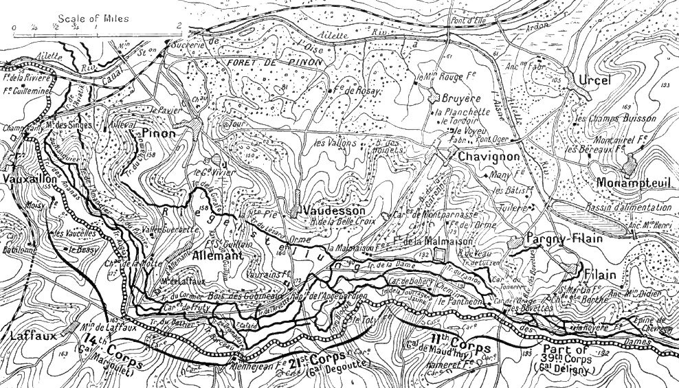 작전 개시 시각은 오전 5시 45분으로 정해졌지만 프랑스군은 독일군의 전선 주둔군에 오전 5시 30분에 준비하라는 명령을 가로채 작전 개시 시각을 오전 5시 15분으로 변경했다. 오전 6시에 비가 내리기 시작했고, 63대의 슈나이더 CA1과 생 샤몽 전차가 진흙에 빠졌다. 프랑스 보병과 21대의 전차는 계획대로 독일군 제2 진지에 도달했다. 제38사단은 Fort de Malmaison프랑스어을 점령했고, 제21군단은 알르망과 보드송을 점령했다. 10월 25일에는 피뇽 마을과 숲이 점령되었고, Canal de l'Oise à l'Aisne프랑스어 선에 도달했다. 프랑스는 4일 만에 약 9.66km를 진격했고, 11월 1일/2일 밤까지 독일군을 슈망 데 다므에서 몰아내 Ailette 계곡 북쪽 강둑으로 후퇴시켰다. 프랑스는 10월 23일부터 26일까지 11,157명의 포로, 200문의 포, 220문의 중박격포를 획득했으며, 약 10,000명의 사상자가 발생했다.