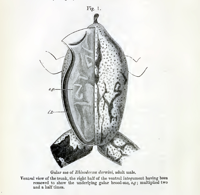 암컷은 일반적으로 한 번에 4-10개의 알을 낳는다. 수컷은 한 번에 5-8마리의 올챙이를 육아할 수 있다. 어떤 경우에는 암컷 ''R. darwinii''가 한 번에 최대 40개의 알을 낙엽층에 낳을 수 있다. 수컷은 약 3~4주 후에 발달하는 배아가 움직이기 시작하는 것을 알아차리고, 알을 삼켜 성대낭에 보관한다. 대부분의 육아 수컷은 녹색을 띤 개체이다. 알은 약 3일 후에 부화하고 아버지는 올챙이가 변태할 때까지 성대낭에서 계속 운반하며 난황과 낭벽에서 생성되는 분비물을 먹도록 한다. 올챙이를 삼킨 지 6주 후, 성체 수컷은 음식을 섭취하지 않는다고 생각되었다. 그러나 1888년 G. B. Howes는 육아 중인 수컷 ''R. darwinii''를 해부하여 위에서 딱정벌레와 파리를 확인했다. 성체 수컷의 큰창자 또한 정상 개체의 그것과 유사했다. 그는 "이 특별한 부성애 본능이 자기 희생으로 이어지지는 않는다"라고 결론 내렸다. 이어서 작은 개구리가 수컷의 입에서 튀어나와 흩어진다.