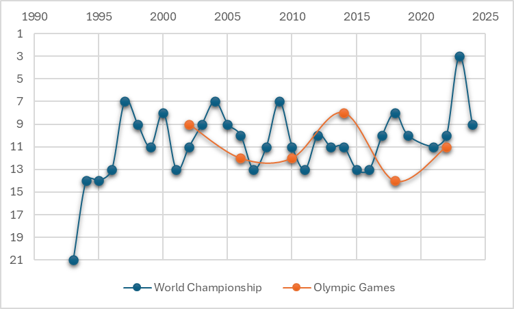 2023년에는 핀란드와 공동 개최한 세계 선수권 대회에서 미국을 꺾고 동메달을 획득하며 역대 최고 성적을 기록했다.