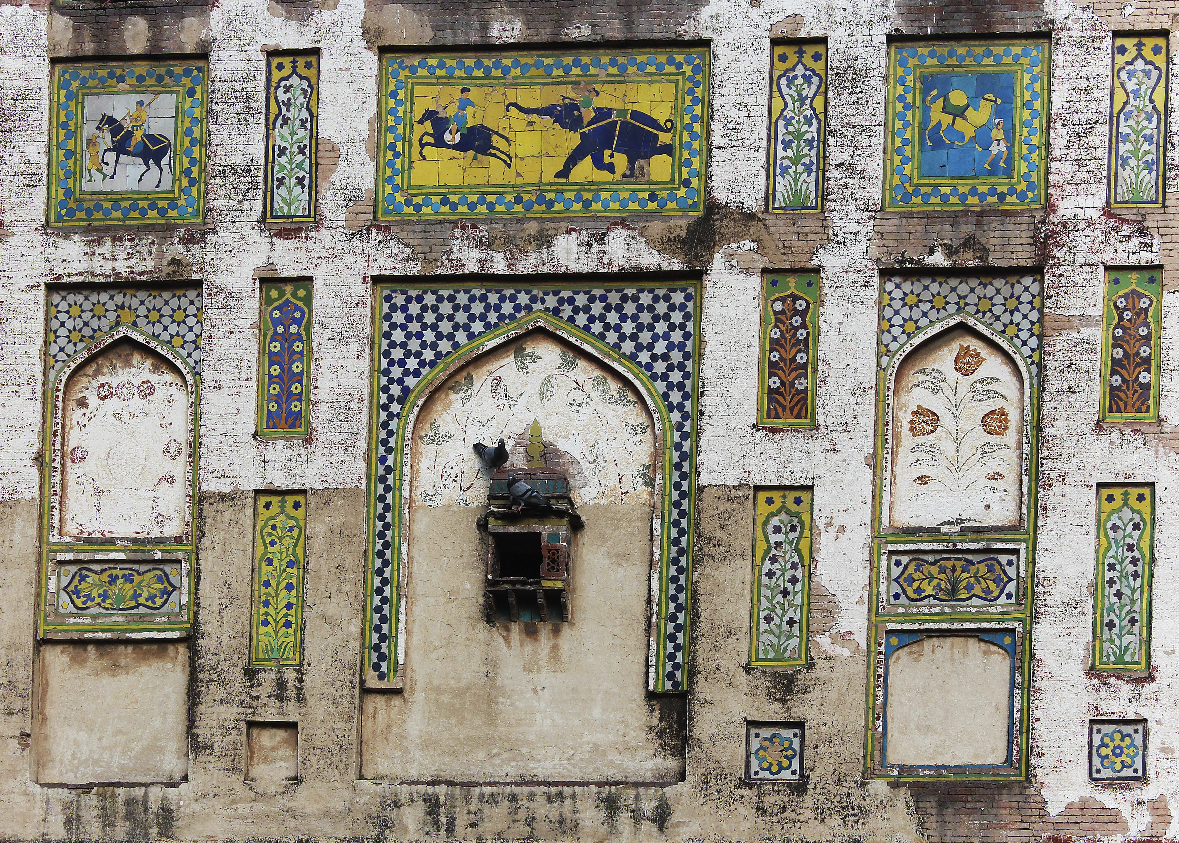 자한기르는 약 441.96m x 약 15.24m 크기의 거대한 그림 벽을 만들었는데,[15] 이 벽은 화려한 색상의 유약을 바른 타일, 파이앙스 모자이크, 프레스코화로 장식되어 있다.[15] 자한기르의 ''크와브가'' (황실 침실) 아래에는 고대 페르시아 신화의 날개 달린 용인 ''아즈다하스''와 컵을 든 천사, 왜가리, 두루미 및 기타 날아다니는 새들이 묘사되어 있다. '그림 벽'의 많은 장면들은 무굴 통치자들의 궁정 생활, 스포츠, 오락을 보여주는데, 특히 네 명의 기병이 폴로를 하는 모습과 코끼리 싸움 장면이 유명하다.[16][17]