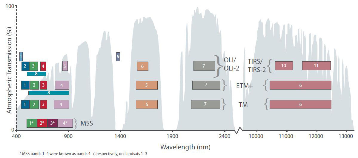 센서 | 다중 분광 스캐너 (MSS) 주제 지도 작성기 (TM) 향상된 주제 지도 작성기 플러스 (ETM+) 운영 육지 이미저 (OLI) 열 적외선 센서 (TIRS) |