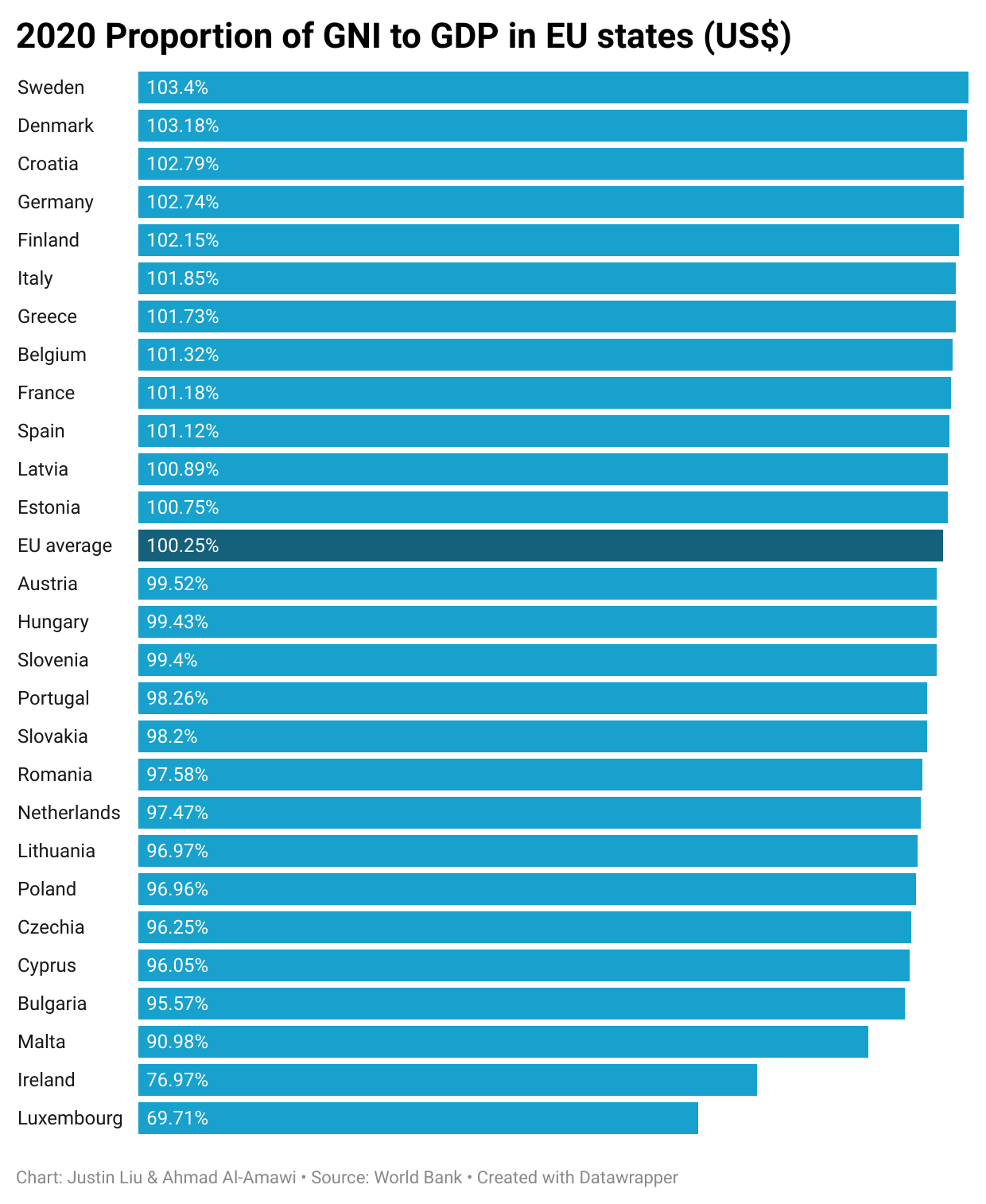Eurostat을 포함한 많은 경제학자들은 아일랜드의 수정 GNI가 여전히 왜곡되어 있으며, 아일랜드 BEPS 도구가 EU-28의 통합 데이터와 EU-미국 무역 적자를 왜곡한다고 지적한다.[27] 2020년, 아일랜드는 성장을 위해 EU의 제한을 무시하기도 하였다.[28]