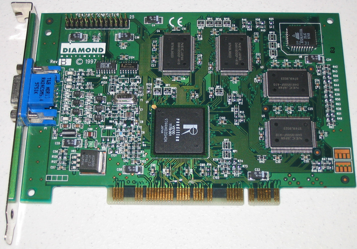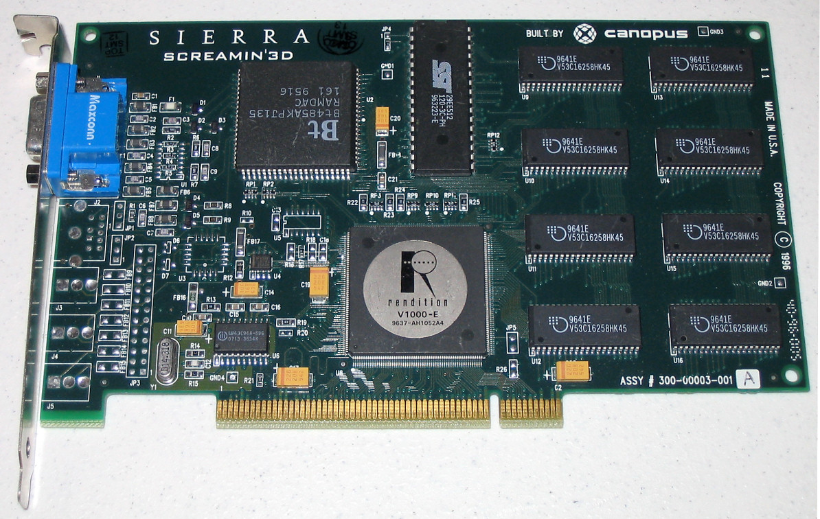 Rendition영어의 V1000 칩셋은 1996년에 출시되었으며, RISC 기반 아키텍처로 유명했다. V1000은 프로그래밍 가능한 코어를 사용하여 3차원 그래픽을 렌더링하는 최초의 PC 그래픽스 카드였다. V1000은 매트록스 밀레니엄, ATI 레이지/3D, S3 Virge3D와 같은 경쟁사들보다 더 빠르고 더 진보했다.[6] 오직 3DFX의 부두 그래픽스만 더 빨랐으나, 3DFX 부두와 달리 V1000에는 2D/VGA 기능이 포함되어 있어 3D 게이밍을 위한 최초의 싱글 보드 솔루션이 되었다.Vérité는 64비트 버스에서 최대 4 MiB EDO DRAM의 로컬 프레임버퍼를 지원했다(이론적으로 400 MB/초의 대역폭). 3D 게이밍 외에도 Vérité에는 IBM VGA 호환 디스플레이 컨트롤러가 포함되었고 윈도우 운영 체제를 위한 전통적인 2D/GUI 가속기 역할을 하였다.
