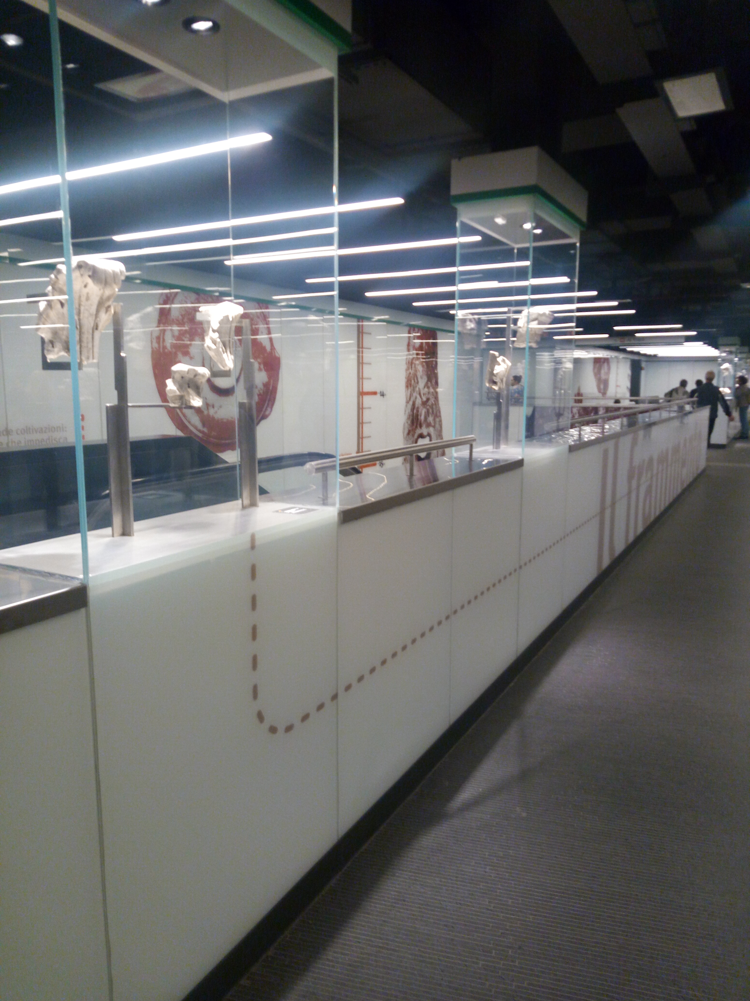 전시는 복도를 따라 유물을 위한 도서관, 벽에 설명 패널, 대합실에서 승강장까지 이어지는 승객 동선에 따른 역사적 시기 측정을 특징으로 하는 일종의 투어 형태로 구성된다.
