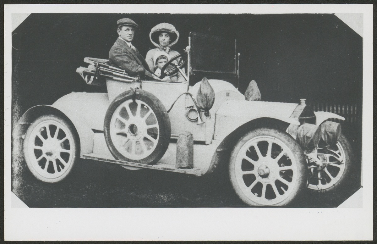 20세기 초 오픈탑 자동차에 탄 젊은 남녀와 그 사이에 어린 아이가 있는 흑백 사진