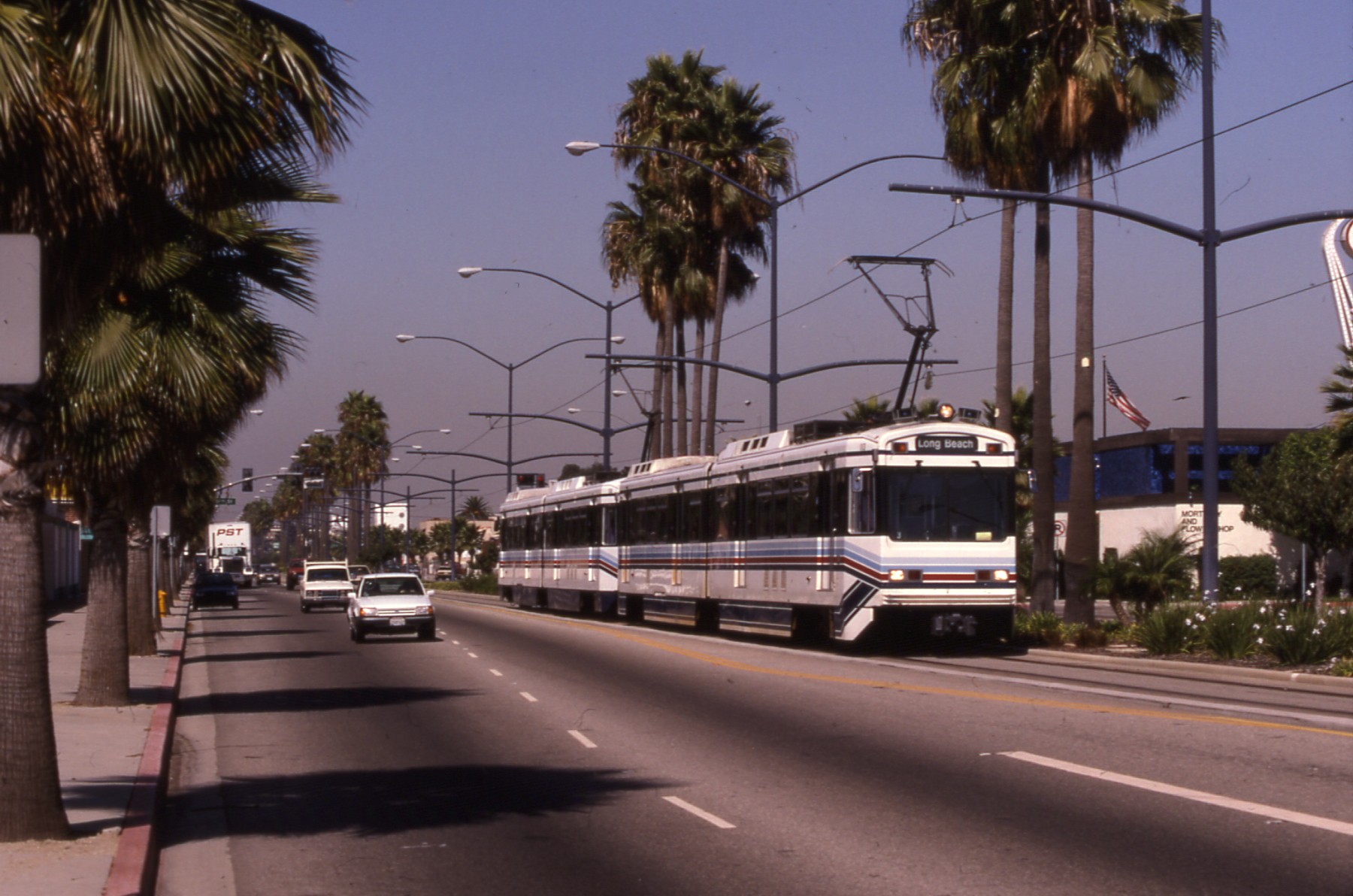 일본 차량 P865 열차(현재 퇴역)가 다운타운 롱비치역을 출발하고 있다.