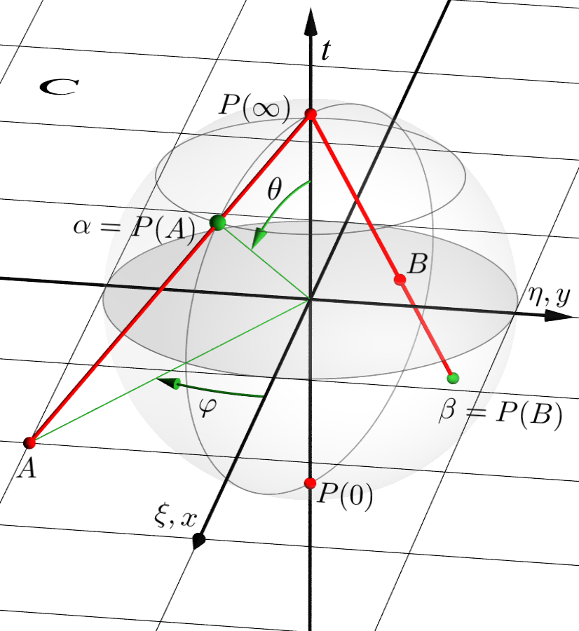 마찬가지로, 에서 평면 으로의 스테레오그래픽 투영은 로 또 다른 복소 평면과 동일시되며, 다음과 같이 표현된다.