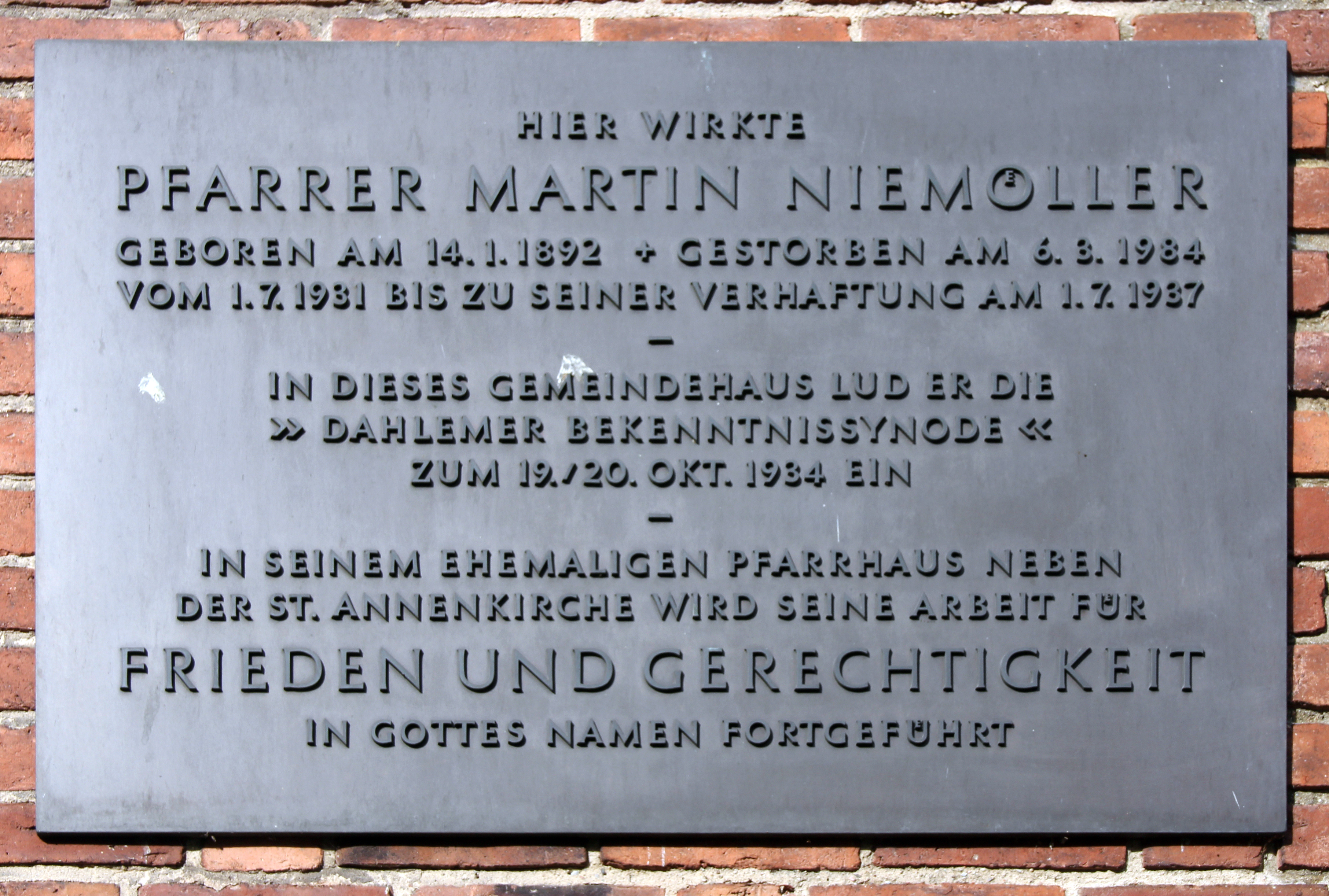 1931년, 니묄러는 베를린의 부유한 교외 지역인 다렘에 있는 예수 그리스도 교회(성 안네 교회와 함께 교회를 구성)의 제3 목사로 초빙되었다.[11] 1932년에는 성 안넨 교회 담당 목사로 임명되었으며, 그의 목사 취임식은 다렘 복음주의 교회 공동체의 또 다른 교회인 예수-그리스도 교회에서 거행되었다.