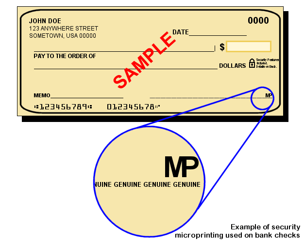 은행 수표와 같은 다양한 유가 증권에도 마이크로프린팅 기술이 흔히 활용되지만, 화폐만큼 극단적인 크기는 아닌 경우가 많다. 예를 들어, 개인 은행 수표는 일반적으로 서명란 옆에 ''MP'' 문자를 표기하는데, 이는 '마이크로프린트(Microprint)'를 의미하며 서명란이나 다른 부분이 마이크로프린트 문자로 이루어져 있음을 나타낸다. 복제가 어려운 마이크로프린트 문자는 위조 방지 기능으로 사용되며, 눈에 띄는 MP 표기는 해당 품목에 마이크로프린트가 사용되었음을 알려 위조 시도를 억제하는 역할을 한다.