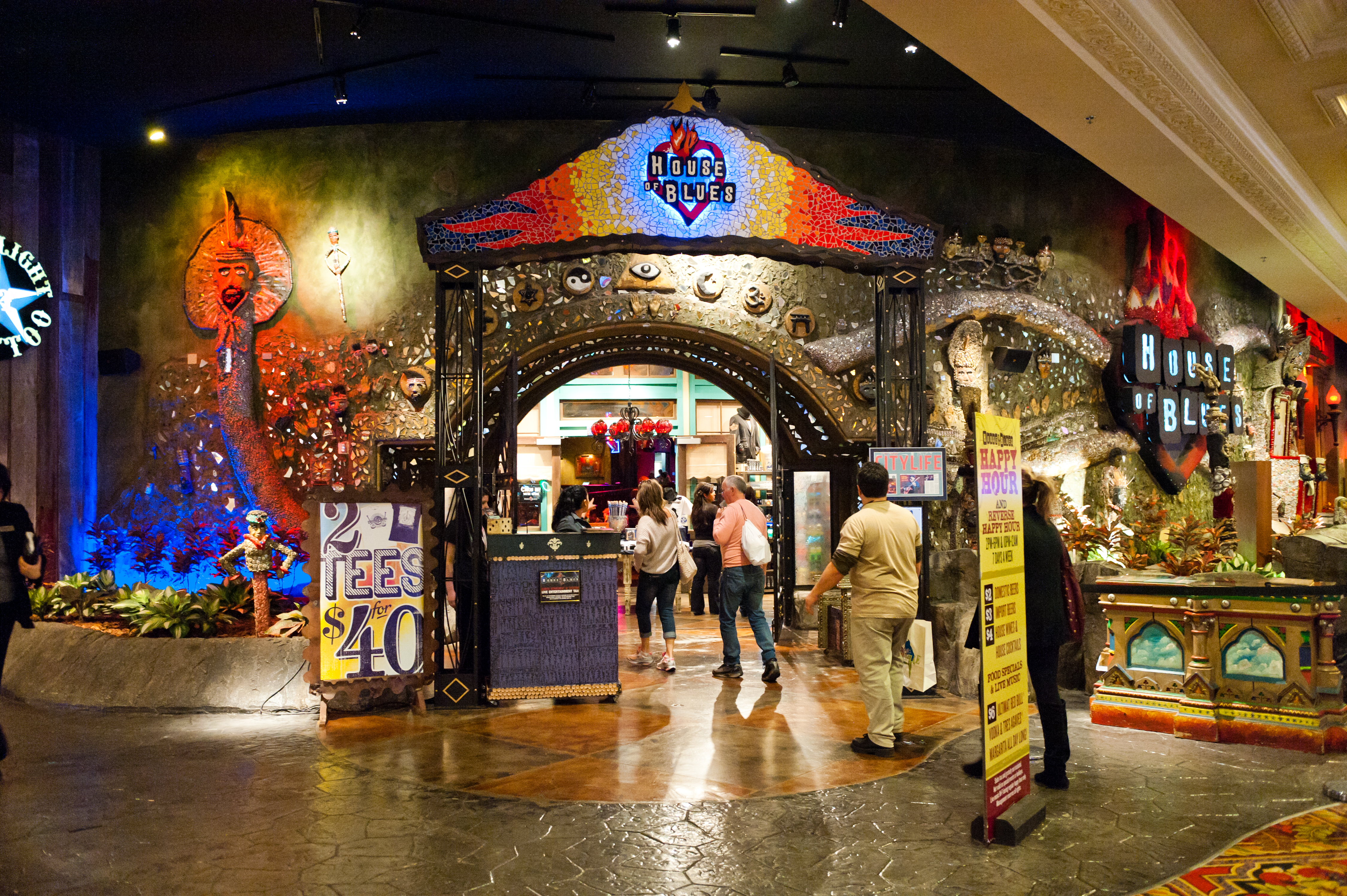 하우스 오브 블루스 음악 공연장과 레스토랑은 체인점의 일곱 번째 지점으로, 2층 규모에 콘서트 시 1,800명을 수용할 수 있으며, 규모의 소매점도 갖추고 있습니다.[176][177][178][175] 하드 록 호텔과 경쟁했으며, 카를로스 산타나가 2012년부터 2026년 5월까지 레지던시를 연장하는 등 수많은 연예인을 초청했습니다.[177][178][179][180][181][182][183][184] 예스의 ''하우스 오브 예스: 라이브 프롬 하우스 오브 블루스''(2000년), 메이시 그레이의 ''라이브 인 라스베이거스''(2005년) 등 두 개의 라이브 앨범도 녹음되었습니다.[185][186]