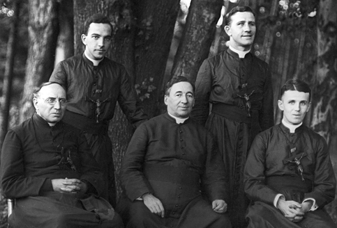 1918년 뉴욕 메리놀에서 메리놀회 사제·형제회의 공동 창립자인 토머스 F. 프라이스 신부(왼쪽)와 제임스 A. 월시 신부(가운데)가 메리놀회 사제인 제임스 E. 월시(오른쪽), 프랜시스 X. 포드(서있는 인물), 버나드 마이어와 함께 찍은 사진