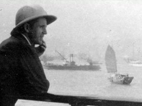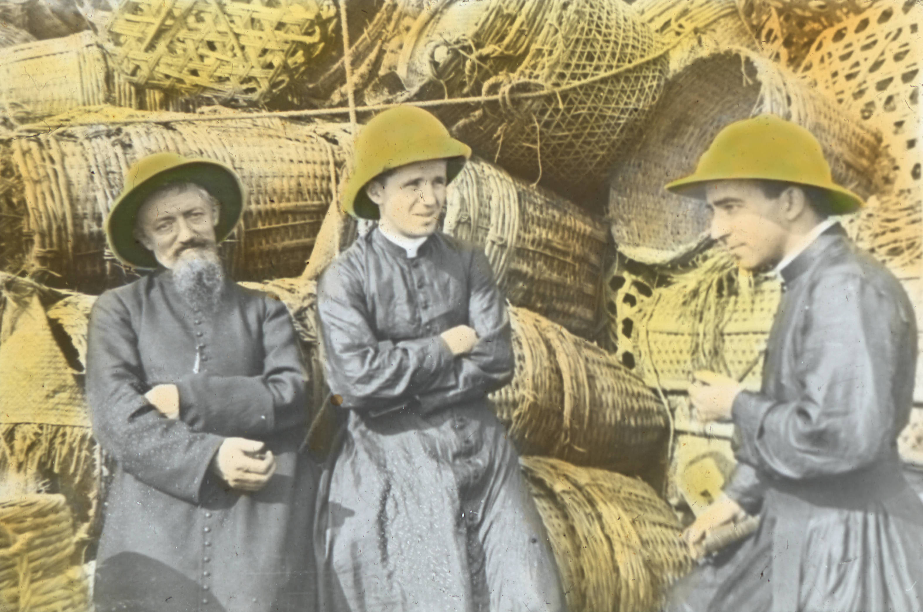 1918년경-1938년 메리놀회 신부 제임스 에드워드 월시(왼쪽에서 두 번째), 프란시스 자비에르 포드(왼쪽에서 세 번째), 오귀스트 고티에 주교와 함께 찍은 컬러 랜턴 슬라이드. 배경에는 엮은 바구니가 놓여 있다. 세 사람 모두 수단과 피스 헬멧을 착용하고 있다.