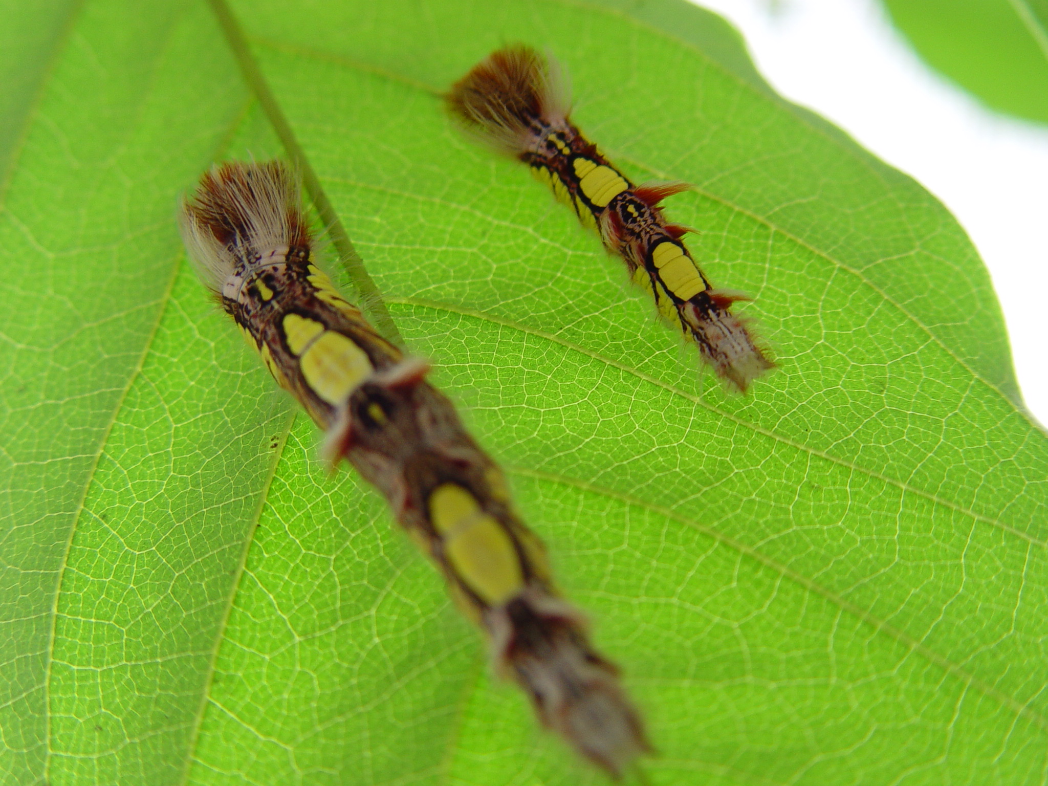 애벌레는 옅은 녹색의 이슬 방울 모양의 알에서 부화한다. 붉은 갈색 몸에 등에는 밝은 라임색 또는 노란색 반점이 있다. 털은 인간의 피부를 자극하며, 방해를 받으면 가슴 부위에 있는 외반선에서 썩은 버터 냄새가 나는 액체를 분비한다. 이 강한 냄새는 포식자로부터의 방어 수단이다. 애벌레는 번데기 단계에 들어가기 전에 다섯 번의 탈피를 한다. 둥근 번데기는 옅은 녹색 또는 옥색이며 만지면 혐오스러운 초음파 소리를 낸다.[15] 먹이 식물의 줄기나 잎에 매달려 있다.[16]