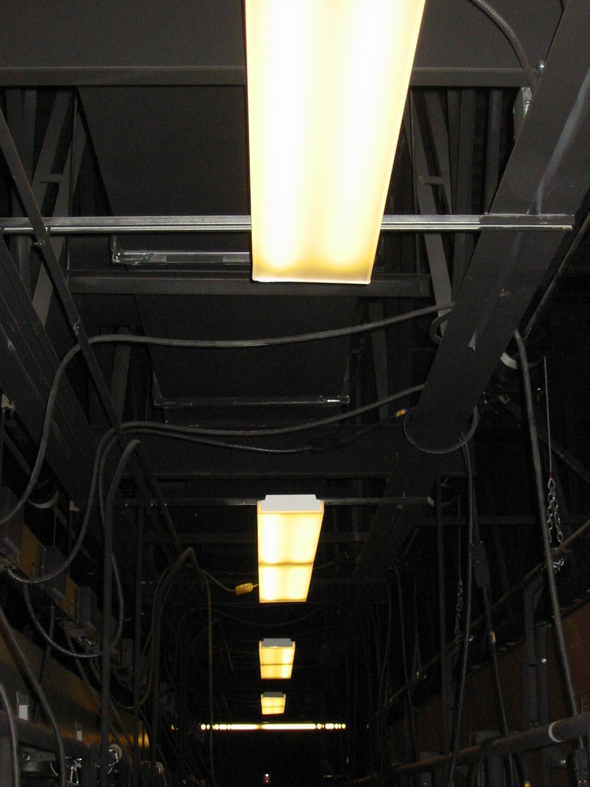 램프 또는 아크 광원모든 조명 기구는 빛을 생성하기 위해 광원을 필요로 하며, 사용되는 전구를 램프라고 한다. 무대 조명 기구는 일반적으로 백열 램프, 텅스텐-할로겐 램프, 캡슐화된 아크 또는 LED를 사용한다.[11] 대부분의 극장 램프는 텅스텐-할로겐 램프인데, 이는 불활성 가스 대신 할로겐 가스를 사용하여 기존 백열전구 디자인을 개선한 것이다. 형광등은 작업등 외에는 거의 사용되지 않는데, 효율은 높지만 디밍이 어렵고 빛을 집중하기 어려우며 워밍업 시간이 필요하기 때문이다.[3]
