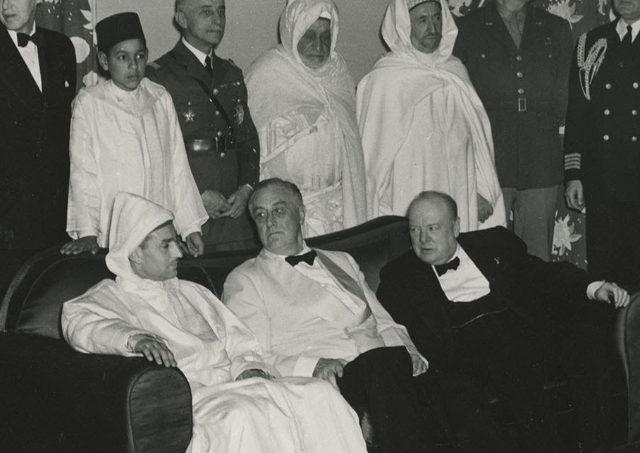 제2차 세계 대전 중 술탄 무함마드 5세는 1943년 1월 카사블랑카에서 개최된 카사블랑카 회담에 참여했다.[8] 1월 22일에는 미국 대통령 프랭클린 D. 루스벨트와 영국 총리 윈스턴 처칠과 비공개 만찬 회담을 가졌다.[8] 이 자리에서 루스벨트 대통령은 술탄에게 전쟁 이후 식민지 문제 등 국제 정세가 크게 변화할 것이라고 언급하며 모로코의 독립 가능성을 시사했다.[8] 당시 14세의 나이로 회담에 동석했던 왕세자이자 훗날 국왕이 되는 하산 2세는 루스벨트가 "10년 후 당신의 나라는 독립할 것입니다."라고 말했다고 회고했다.[8]홀로코스트 기간 동안 무함마드 5세가 모로코 유대인 공동체를 보호하기 위해 어떤 역할을 했는지에 대해서는 상반된 평가가 존재한다.[10] 그러나 대부분의 학자들은 그가 비시 프랑스 정권 하에서 유대인들에게 호의적인 태도를 보였다는 점을 강조한다.[11] 특히 비시 정부가 모로코 내 약 25만 명의 유대인을 유럽의 나치 강제 수용소와 절멸 수용소로 보내기 위해 비시 반유대주의 법안 서명을 강요했을 때 이를 거부한 것으로 알려져 있다.[12] 술탄의 이러한 입장은 인도주의적 동기뿐 아니라, 유대인을 포함한 모든 모로코 신민에 대한 자신의 주권을 침해하려는 비시 정부의 ''칙령''에 대한 반발심에서도 비롯되었다.[12]