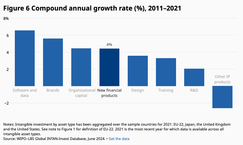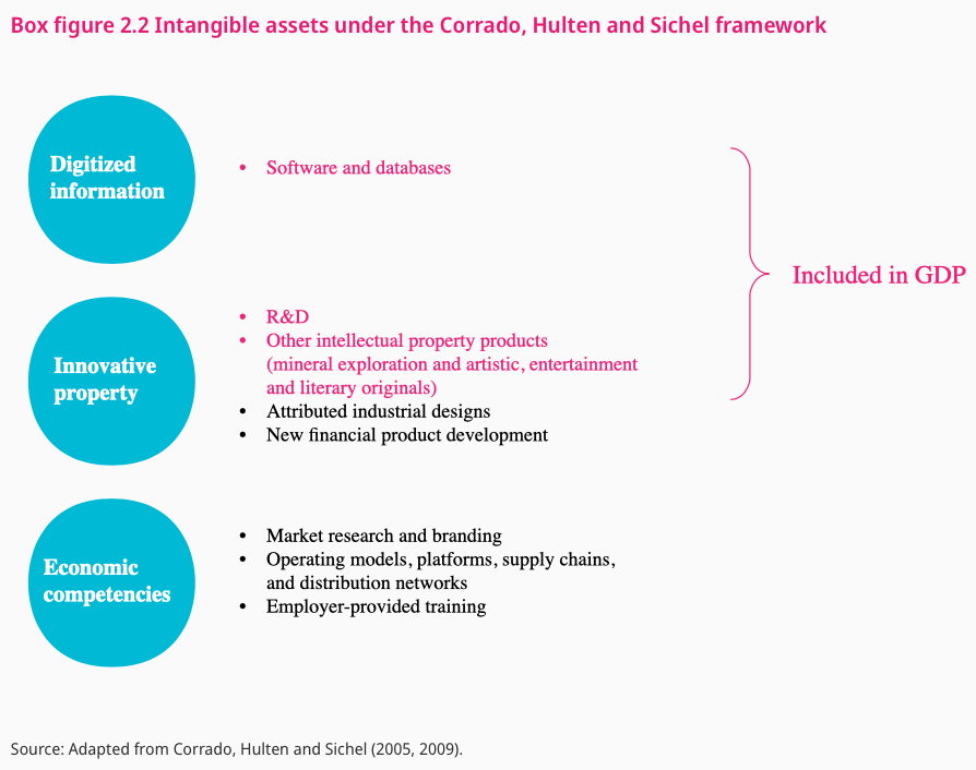소프트웨어 및 데이터와 브랜드는 가장 빠르게 성장하는 두 가지 유형의 무형 자산으로, 2011년부터 2021년까지 R&D보다 3배 더 빠르게 성장했다.[20]