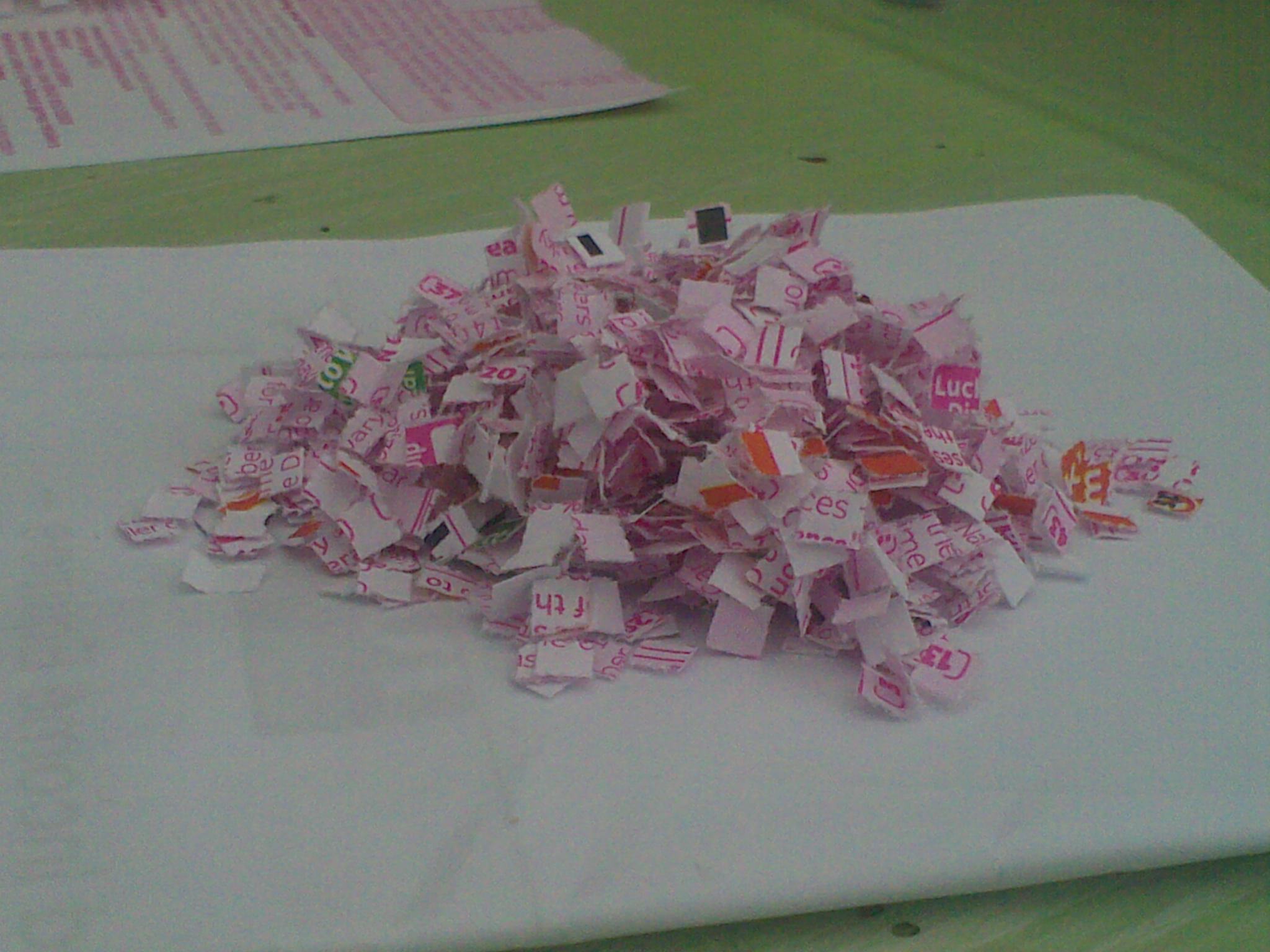 기본 원리 | 날카로운 칼날 또는 톱니를 사용하여 종이를 작은 조각으로 자름 |