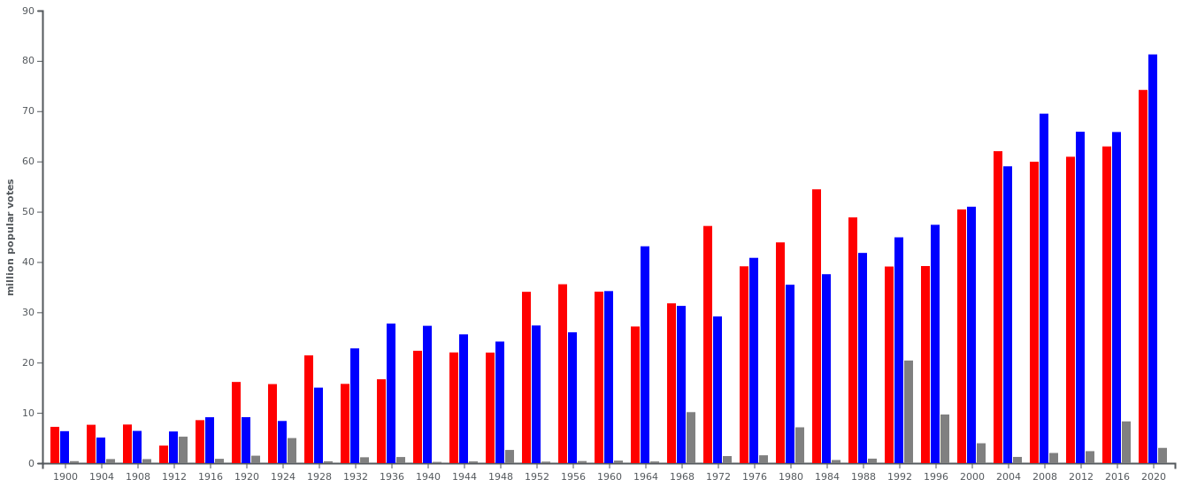 1824년 이후, ‘계약 위반 선거인’을 제외하면 각 주 또는 선거구 득표수가 선거인단 투표를 결정하므로, 대통령 선거 승자는 간접적으로 인기 투표로 결정된다. 전국 인기 투표가 승자를 직접 결정하지는 않지만, 강한 상관관계를 보인다. 59번의 선거 중 54번(약 91%)에서 전국 인기 투표 승자가 선거인단 투표에서도 승리했다. 이 둘이 달랐던 경우는 접전이었던 선거들뿐이었다.[17]