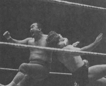후지(왼쪽)가 토니 가레아(오른쪽)를 클로즈라인으로 공격하는 모습