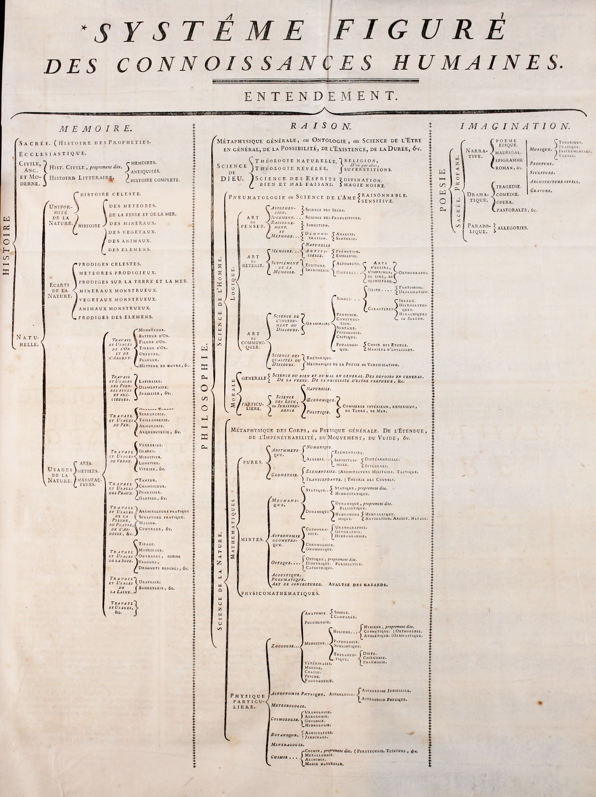 대부분의 백과사전과 마찬가지로, ''백과전서''는 철학, 신학, 과학, 예술 등 다양한 분야의 지식을 수집하고 요약하려 했다. ''백과전서''는 자연이나 신학이 아닌 인간 이성에 기반하여 지식을 재구성했기 때문에 논란이 되었다.[32] 지식과 지성은 인간 사고의 세 가지 범주에서 나왔고, 신학을 포함한 다른 모든 지식은 이러한 인간이 만든 범주의 가지였다.[33] 달랑베르의 "서론"은 계몽 사상의 중요한 설명으로, 프랜시스 베이컨의 학문 분류 체계에서 영감을 받았다(그림 3 참조). 지식의 세 가지 주요 분야는 "기억"/역사, "이성"/철학, "상상력"/시이다. 이 지식의 나무는 독자가 ''백과전서'' 내용의 유용성을 평가하고 내용을 구성하는 데 도움이 되도록 만들어졌다.[34] 신학이 "철학" 아래에 배열되어 있고 "하느님에 대한 지식"이 "점술"과 "흑마술"에서 몇 노드 떨어져 있다는 점이 주목할 만하다.