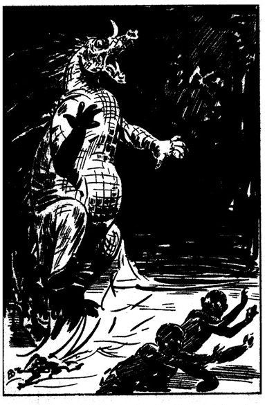 - 쿠사노 타쿠미는 버닙이 거대한 뱀 같은 몸에 새의 머리와 단단한 부리를 가졌다고 설명한다. 그러나 버닙은 사람을 습격해 잡아먹는 괴물이므로 목격자는 모두 잡아먹혀 그 모습을 확실히 아는 사람은 없다고 덧붙였다. 건기에는 땅에 판 구멍 속에 숨어 있다가 우기가 되면 활동을 시작하며, "부"하고 으르렁거리는 듯한 울음소리를 낸다고 한다.